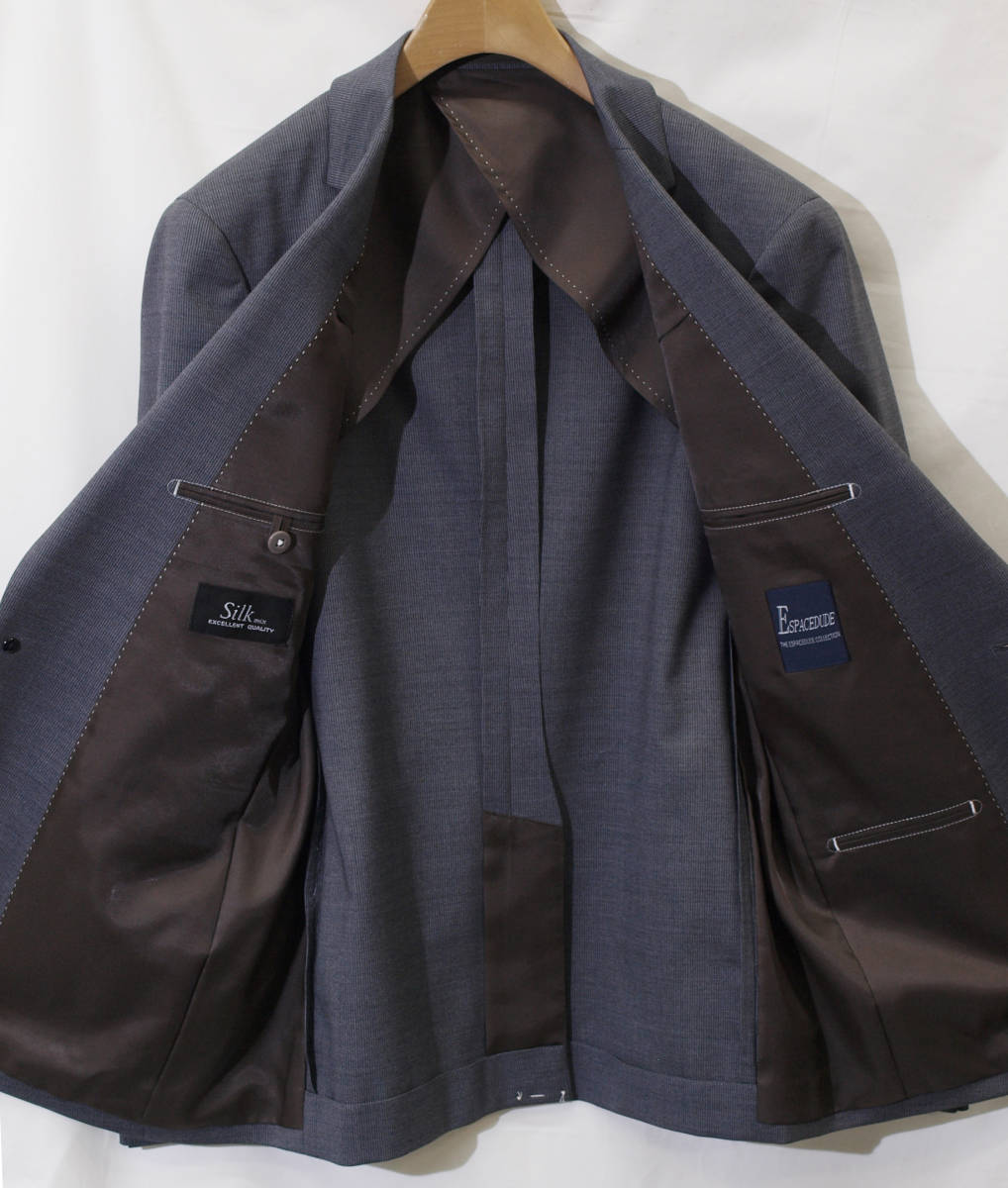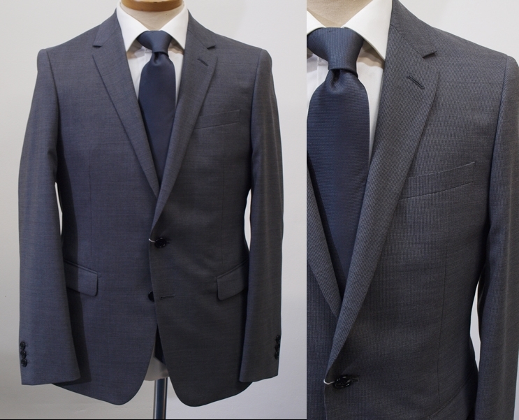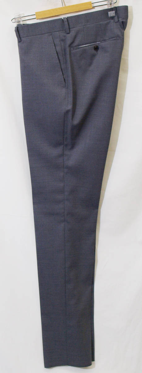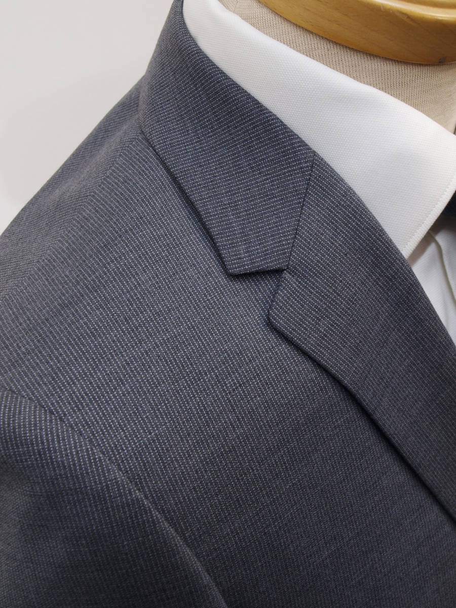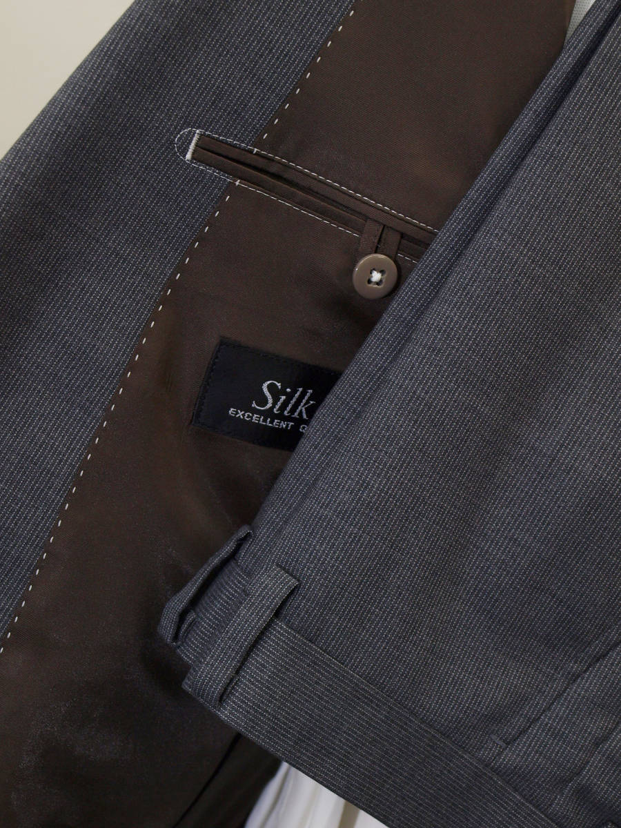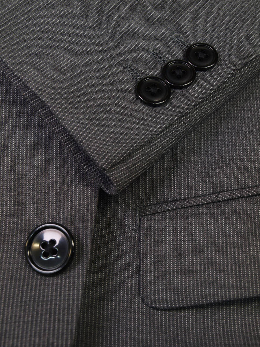 【サイズ】 Y6 (YL/YA6号相当) 目安の体型 身長170cm~180cm、ウエストサイズ78cm前後 【ジャケット実寸】 肩幅42cm 着丈68cm 袖丈62cm 脇下部分49cm 身幅44cm 【パンツ実寸】 ウエスト(胴回り実寸)78cm (平置きでかるくはかると78cmでひっぱってはかると81cmです。)股上が浅いため2~3cm程度大きめに作られております。 わたり幅31cm 股下10cm部分28cm 裾幅18.5cm 脇股上22cm 前股上23cm 股下91cm(裾上げしていない状態/新品) 【素材】 表地:ウール(毛)60% ポリエステル30% シルク(絹)10% 裏地:胴裏/ポリエステル100% 袖裏/ポリエステル100% ほどよいハリとしなやかさをあわせもった春夏向けのやや薄手、紳士スーツ向けシルクウールブレンド素材を使用 【色】 ミディアムグレー 【柄】 オフホワイトでピンドットラインがはいった細ストライプ柄 【デザイン】 ・細いシルエット/スリムフィットタイプのシングルスーツ、新品、裾上げしていない状態です。 ・ジャケットはシングル2つボタンで、すっきりと着こなせるタイトフィット、スリムスーツ ・パンツは股上が浅く細くタイトなテーパードシルエットのノータックスリムパンツ 春~夏~秋口にかけて春夏メインのシーズン対応商品 【仕様】 ・ジャケットはシングル2つボタン、ノッチドラペル、袖口ボタン3つ、センターベント、内ポケット3つ(小ポケット1つ含む)、背抜き(春夏向け) ・パンツはノータック、脇ポケット斜め付け、後ろポケット両玉縁で左のみボタン付き、フロントはファスナーでボタン&ホック仕様/うちかけボタンあり、ヒザ裏付き 細部まできちんとしたビジネススーツの縫製仕立てになっております。