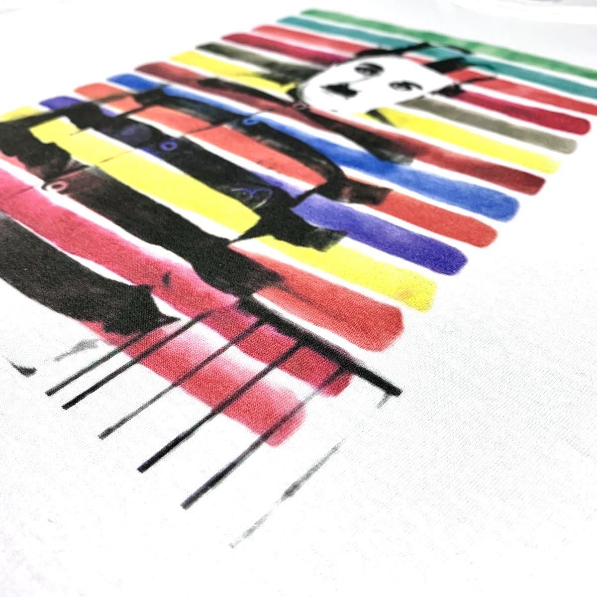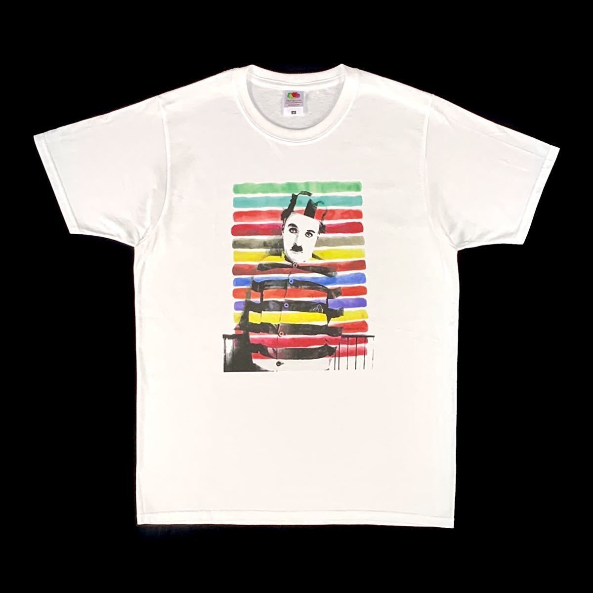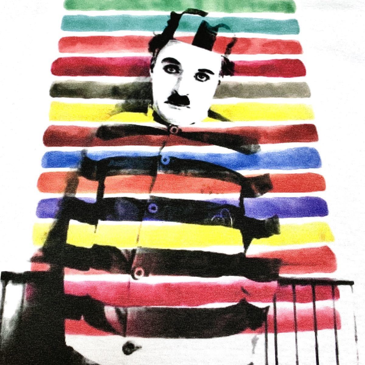 『チャップリンの冒険』での囚人服姿にマルチカラーのボーダーペイントを重ねたアートデザイン。