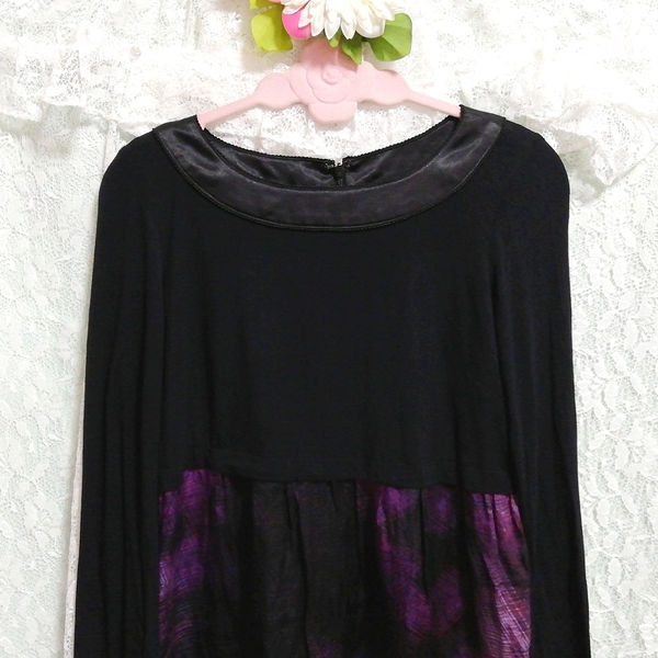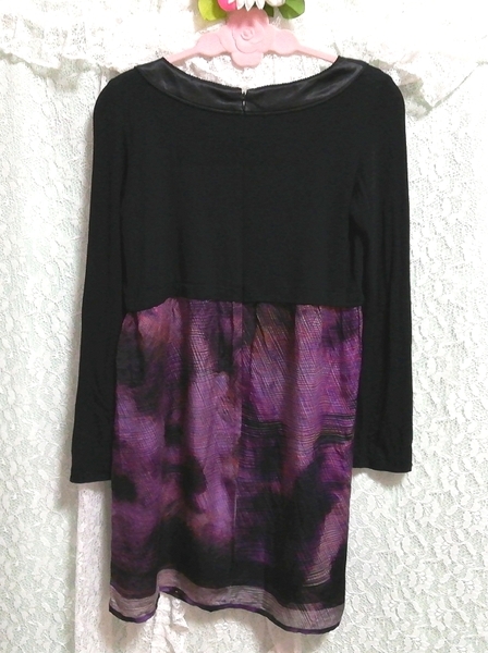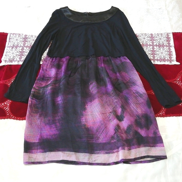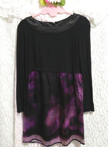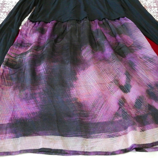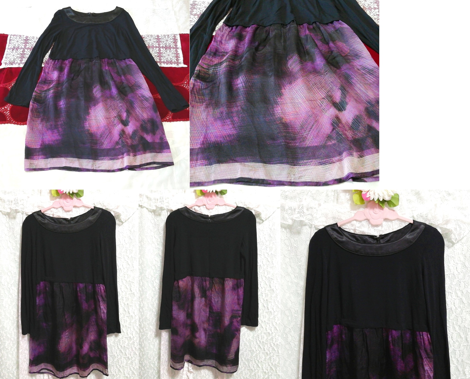 黒紫シフォン絹シルクアート柄スカート長袖チュニック ネグリジェ ワンピース Black purple chiffon silk skirt tunic negligee dress