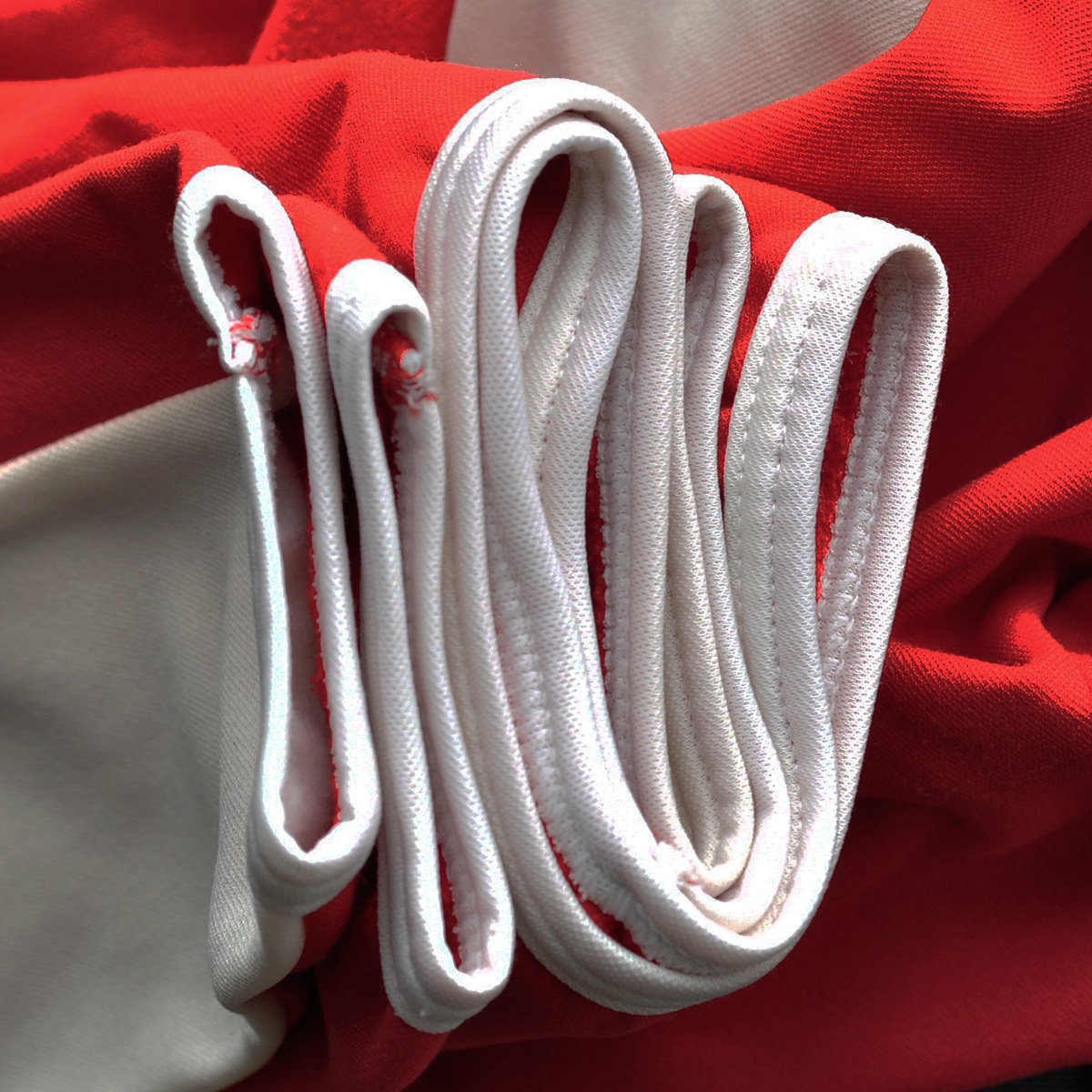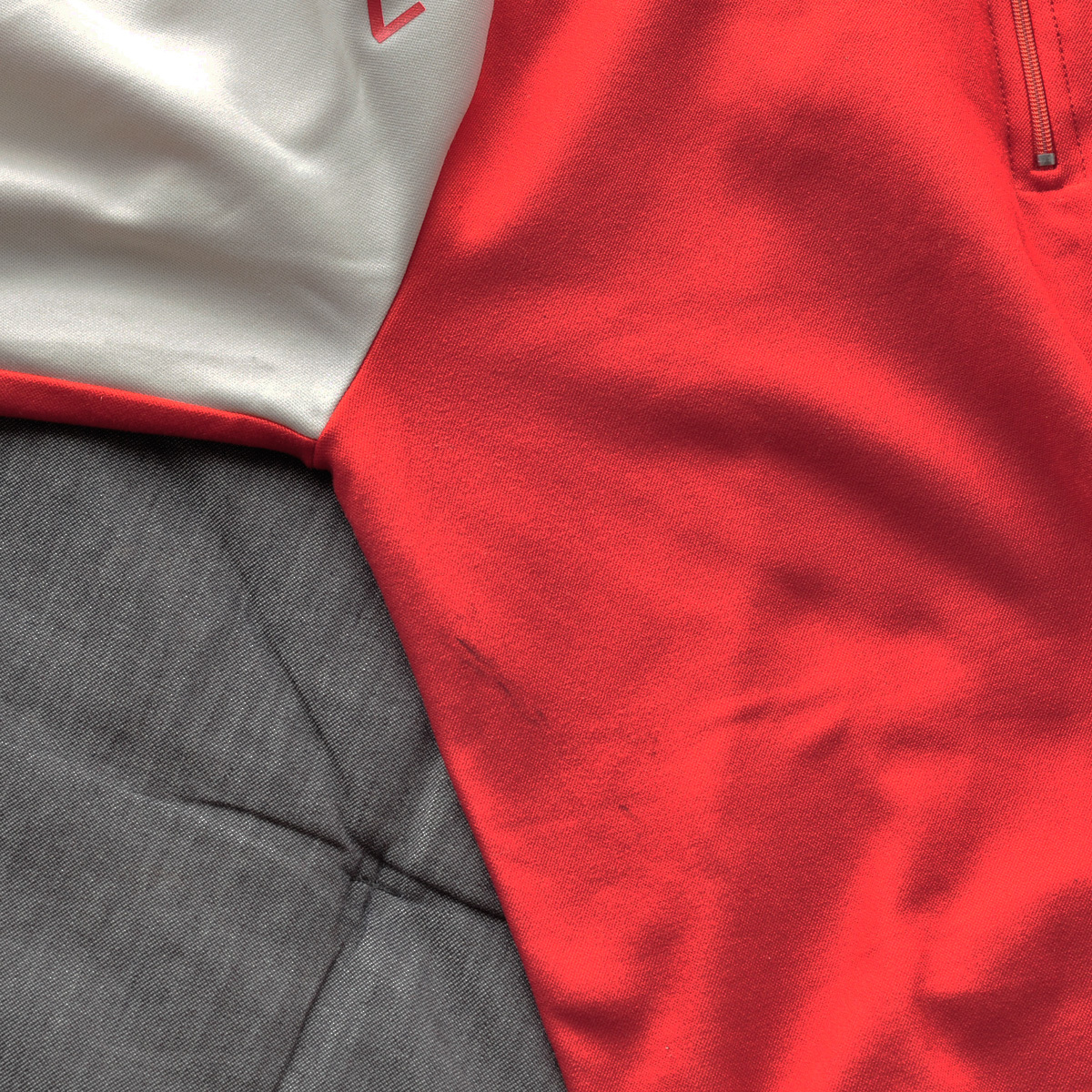 お色はレッド、ホワイト。生地はストレッチ素材。ポケット2つ。