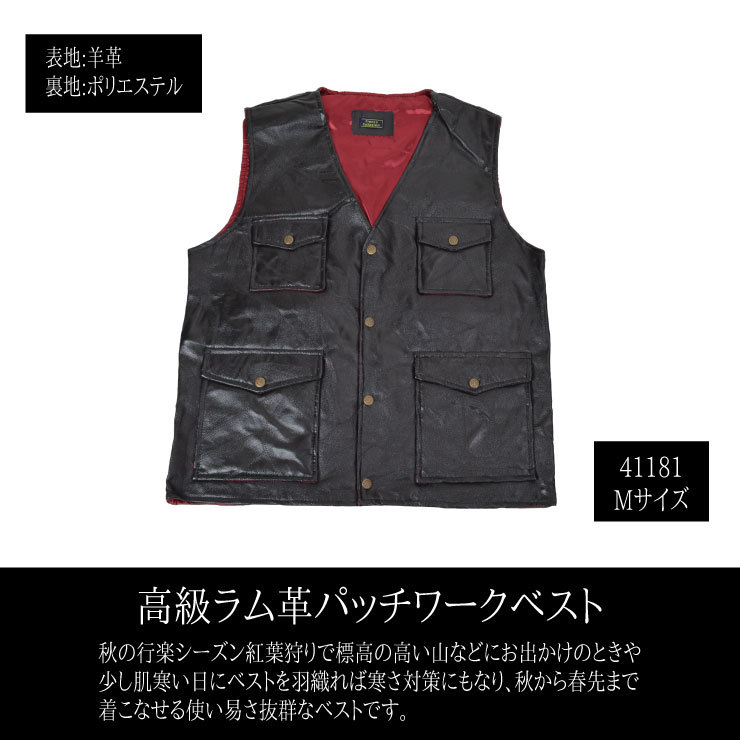 ラム革 パッチワーク ベスト ブラック Mサイズ●41181-M●新品 防寒 紳士 男性 ビジネス カジュアル 黒 本革 羊革 軽量 おすすめ 暖かい Z1