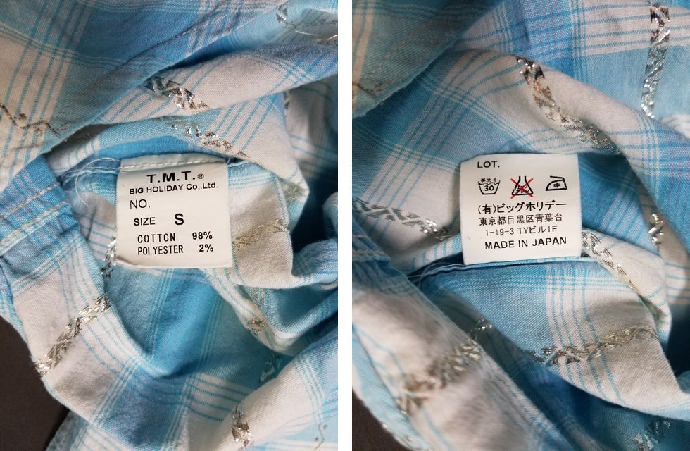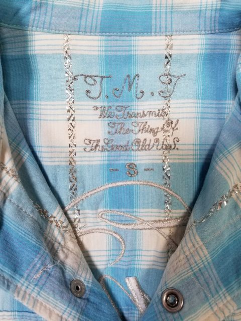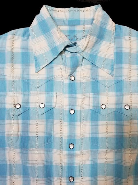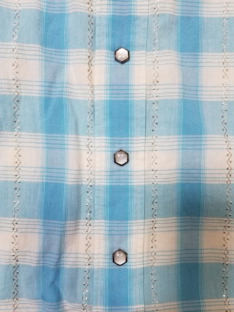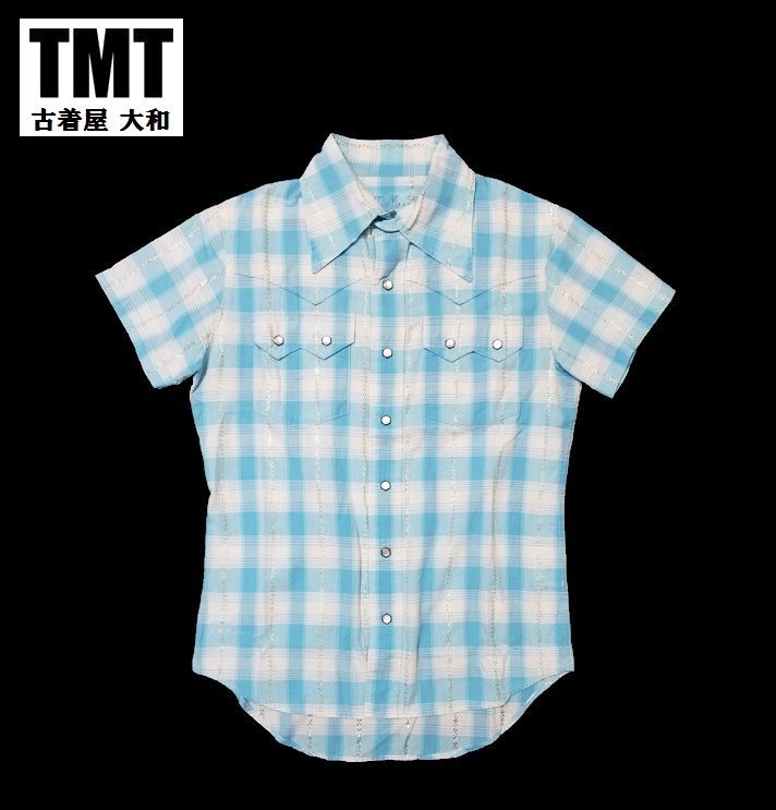 #古着屋大和 アメカジ TMT BIG HOLIDAY ダメージ加工 刺繍入り 半袖 ウエスタンシャツ チェックシャツ Sサイズ スカイブルー シルバーラメ?