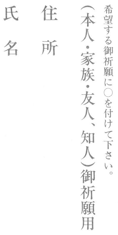 袋の中に人形(ひとがた)と呼ばれる人間の様な形をした紙が入っていることを確認して下さい。この紙は、「大祓い」というお祓いを受けるために必要なものです。中の紙を出して相手の御名前と住所を記入して下さい。ここに書かれた名前で、記入した相手にその願望を呟き、焚き上げ(燃やす)をしてください。燃え尽きるまでに願うことが成就の秘訣です。