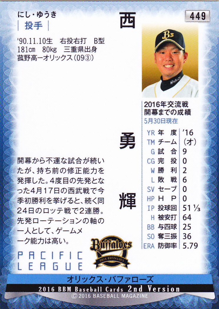 BBM2016ベースボールカード2nd 449 西勇輝 三重県 菰野高校 オリックス・バファローズ