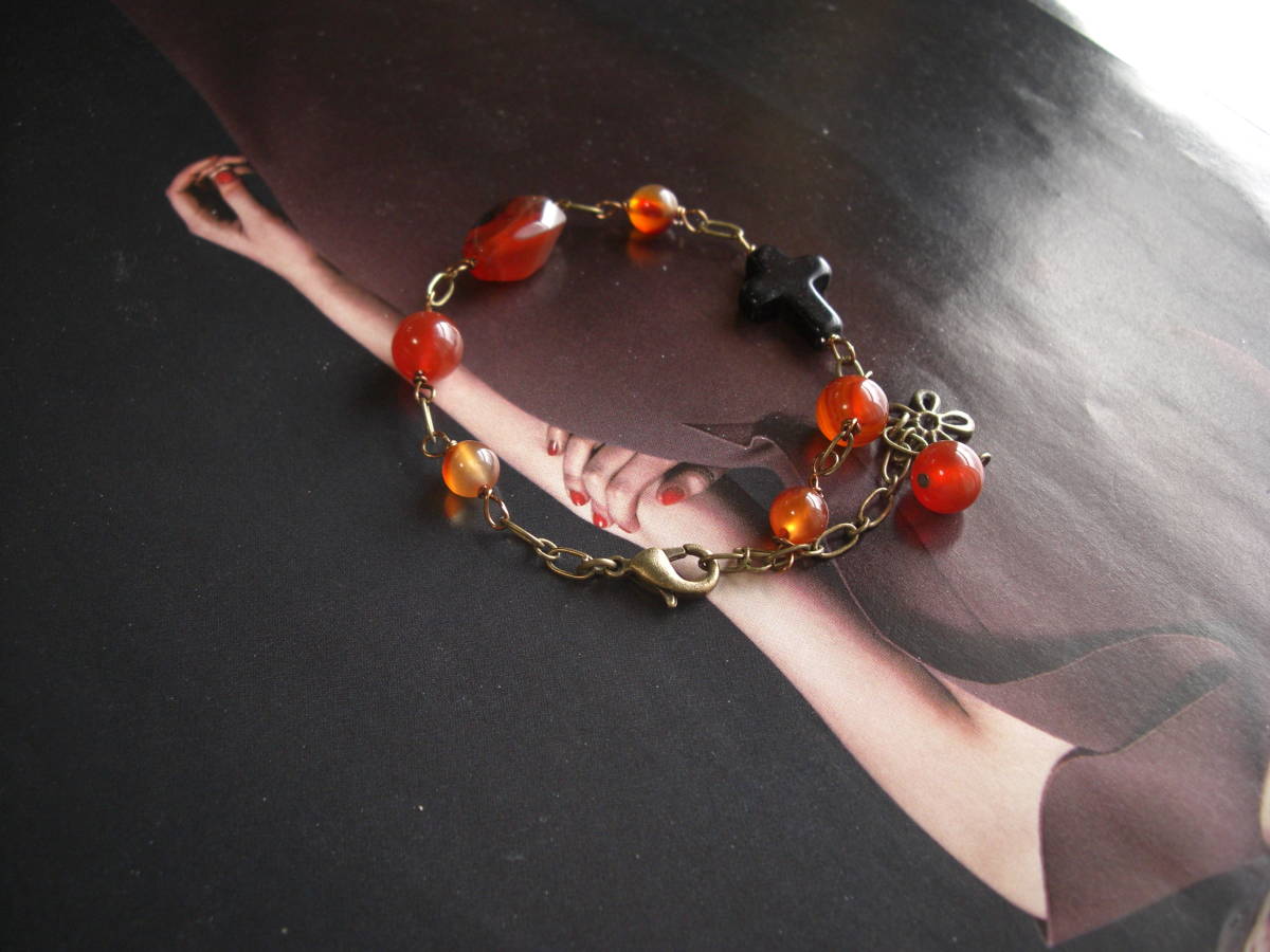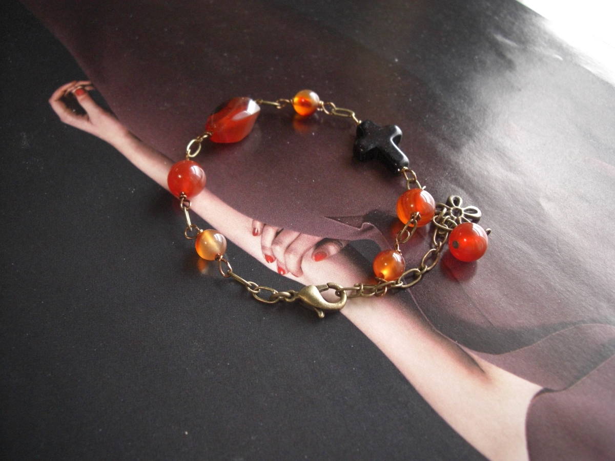 パンク・ガール・・シリーズです♪カーネリアンとオニキスのシックなブレスレットです♪8ミリから13ミリ位までの丸玉やツイストナツメなどデザイン違いのカーネリアンに16ミリ位のオニキスのクロスを合わせて大人パンクしています♪長さは全長22センチ位で調節可能です♪お揃いのシリーズも出品しています。ハンドメイドをご理解頂いてノークレーム、ノーリターンで お願いします