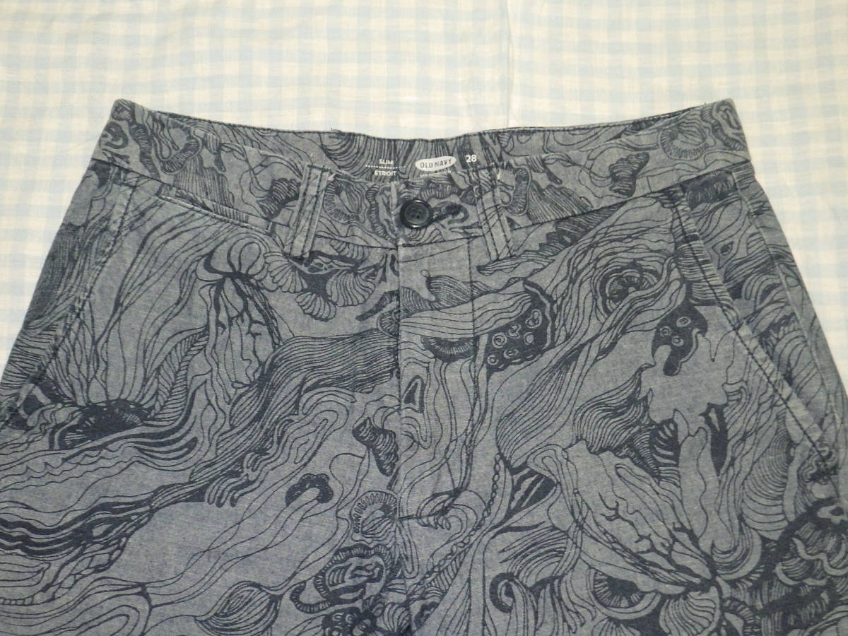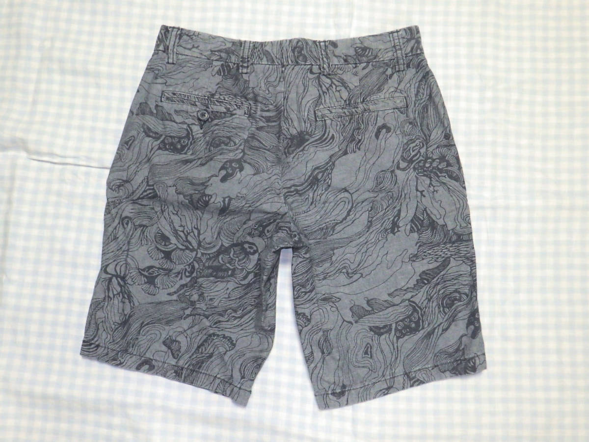 色は紺とうす青(オシャレな柄です。) 脇の左右と後ろの左右にポケットあり 1ヶ所ぽつっと糸の白い球があります。 素材:綿100% サイズ28(S~M) ウエスト76cm股上丈25cm股下丈25cm着丈47cm 他にも洋服、バッグ、靴、小物、本を出品していますので見てください。