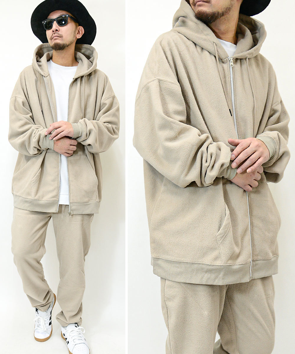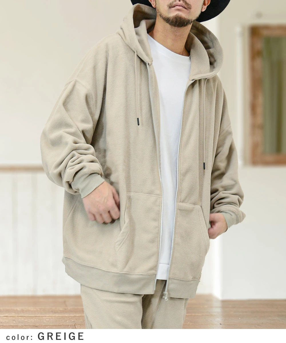 ドロップショルダーのビッグシルエットで演出するジップアップパーカー。