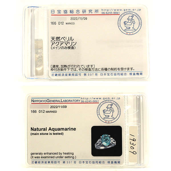 | ソーティング記載 | 天然ベリル アクアマリン (メインのみ検査) 通常、加熱が行われています |