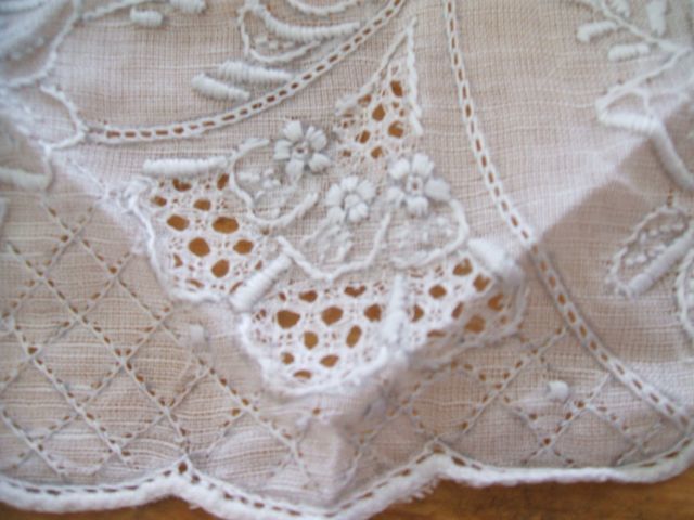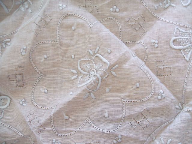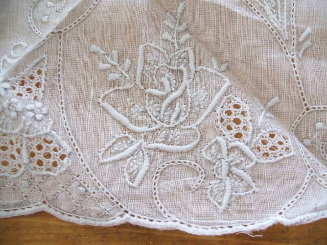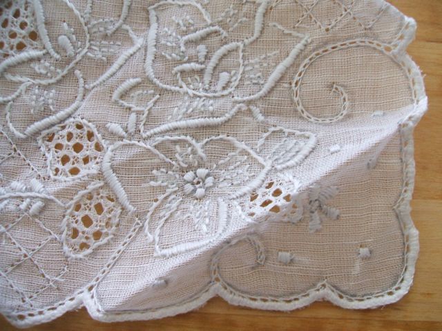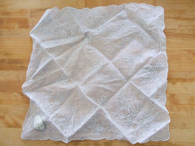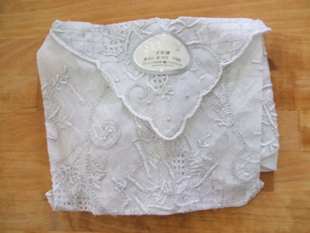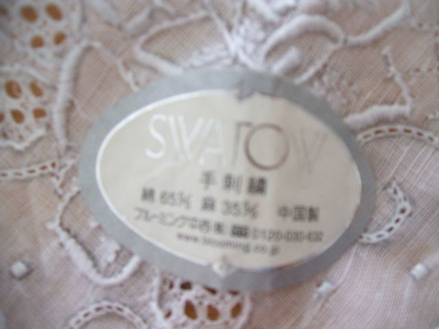 手刺繍だそうです。綿65%麻35%。28.5×28.5cm程度。中国製。ブルーミング中西。