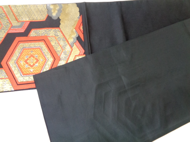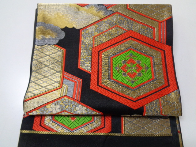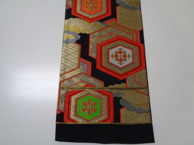 d375-80 袋帯 正絹 六通 黒地 金糸 銀糸 亀甲に花 雲文