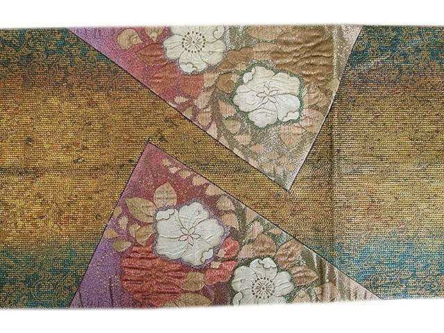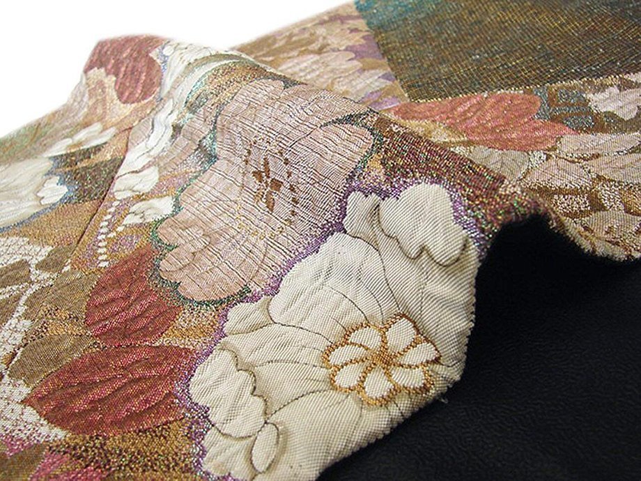 商品説明 | しなやかな扱い易く結び易いフクレ織の重厚感ある袋帯。 光沢感ある金や緑色地に花々のフクレ織。 たいこ柄。 |