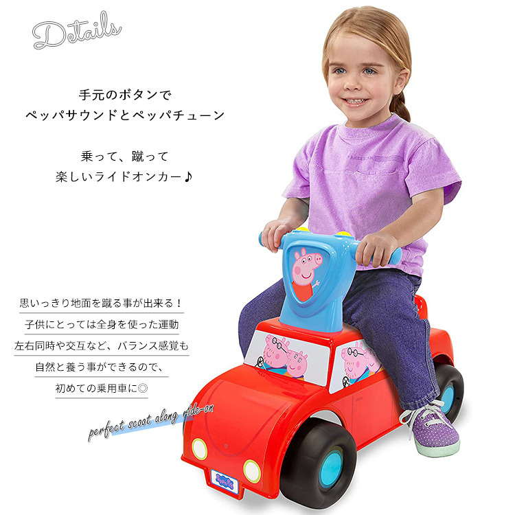 | 仕様 | 初めての足蹴り乗用玩具。 ハーフバースディや1歳のお誕生日プレゼントにぴったり。 両足で蹴って進むので、運動神経の促進に ボタンを押すと、音楽の仕掛けつき。 ハンドルは小さなお子様の手でも握りやすく操縦もしやすい作りです。 |