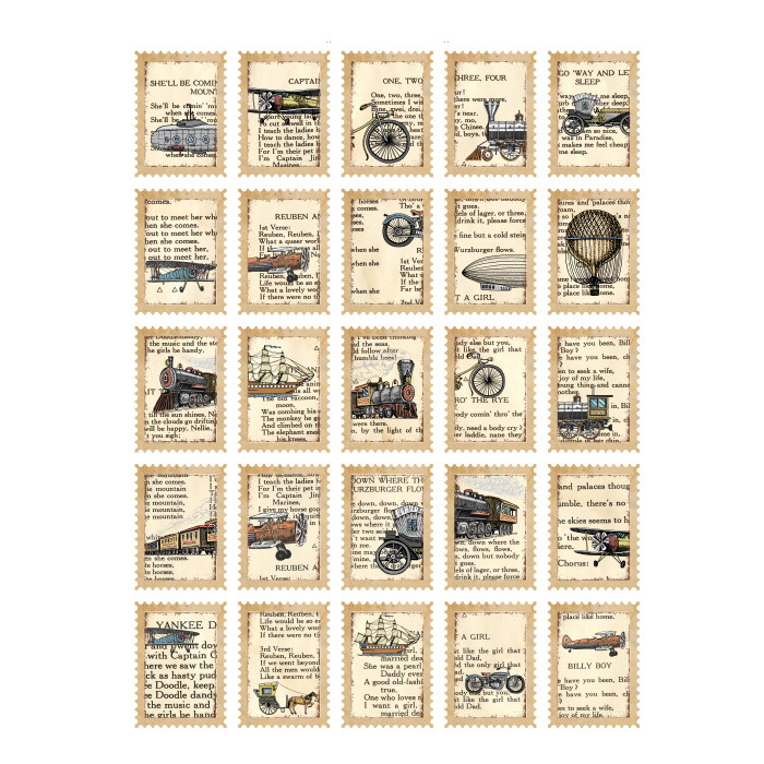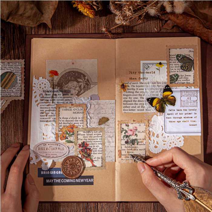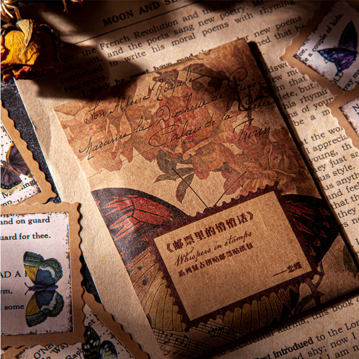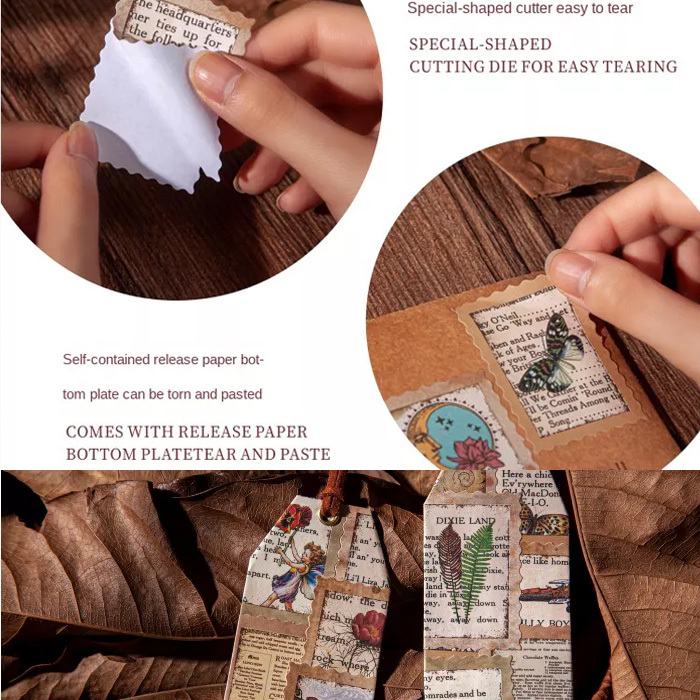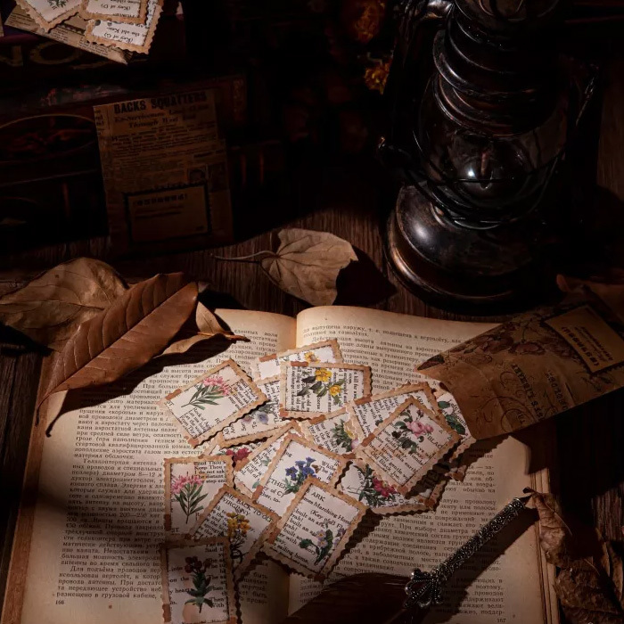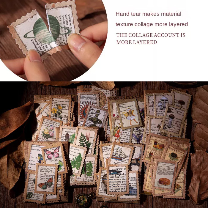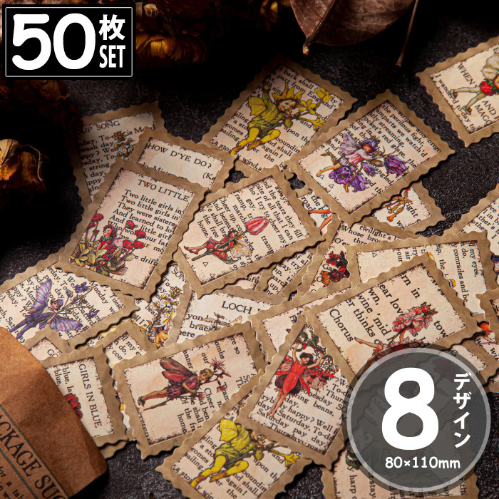 50枚 シール 切手 英字 花 妖精 きのこ アンティーク ビンテージ デコステッカー アンティーク調 コラージュ レトロ 0758-1