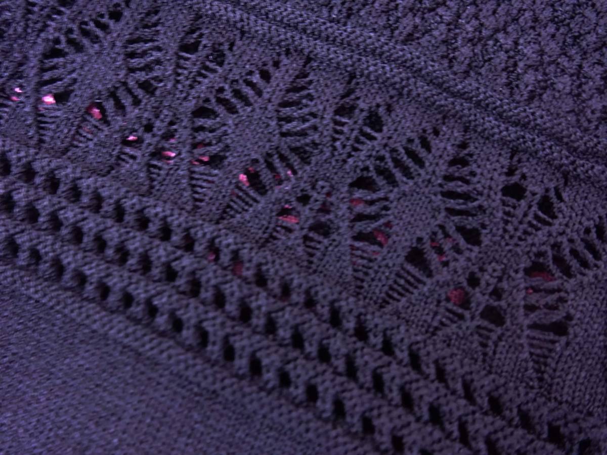 胸と裾の部分はレースのような透かし編みになっており、エレガントをより一層引き立てております。