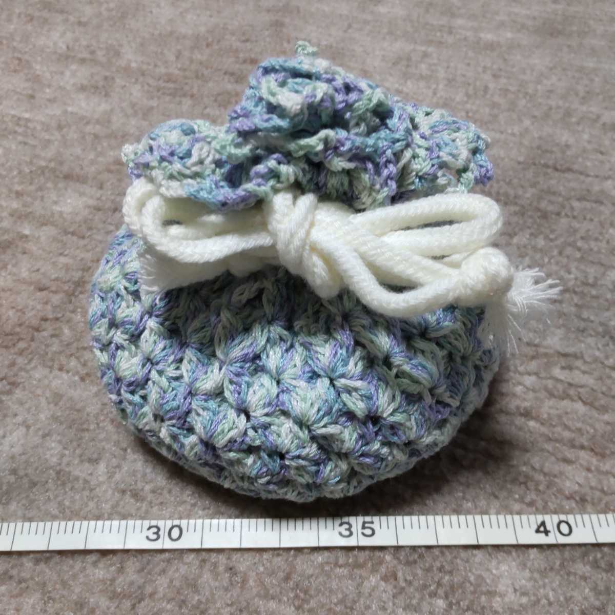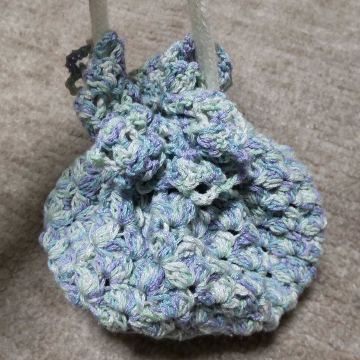 ブルー、グリーン、パープル、ホワイトの4色の糸で編みました。