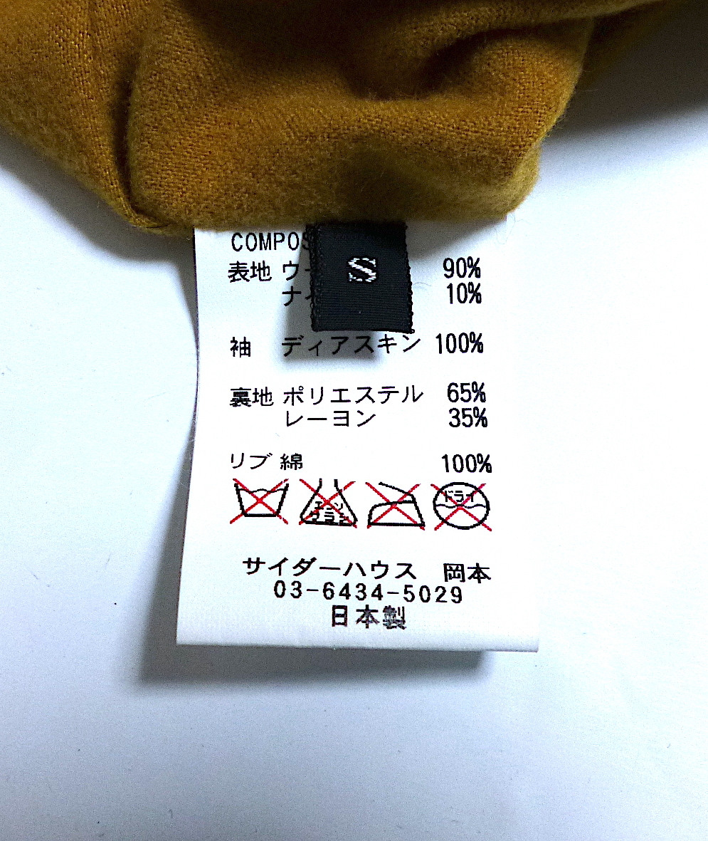 | 素材 | ボディ部分がウール90%ナイロン10%、袖部分がディアスキン100%、裏地がポリエステル65%レーヨン35%。 |