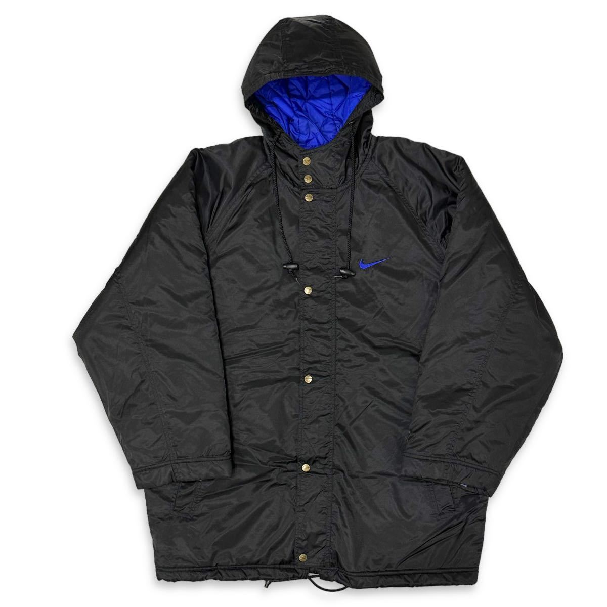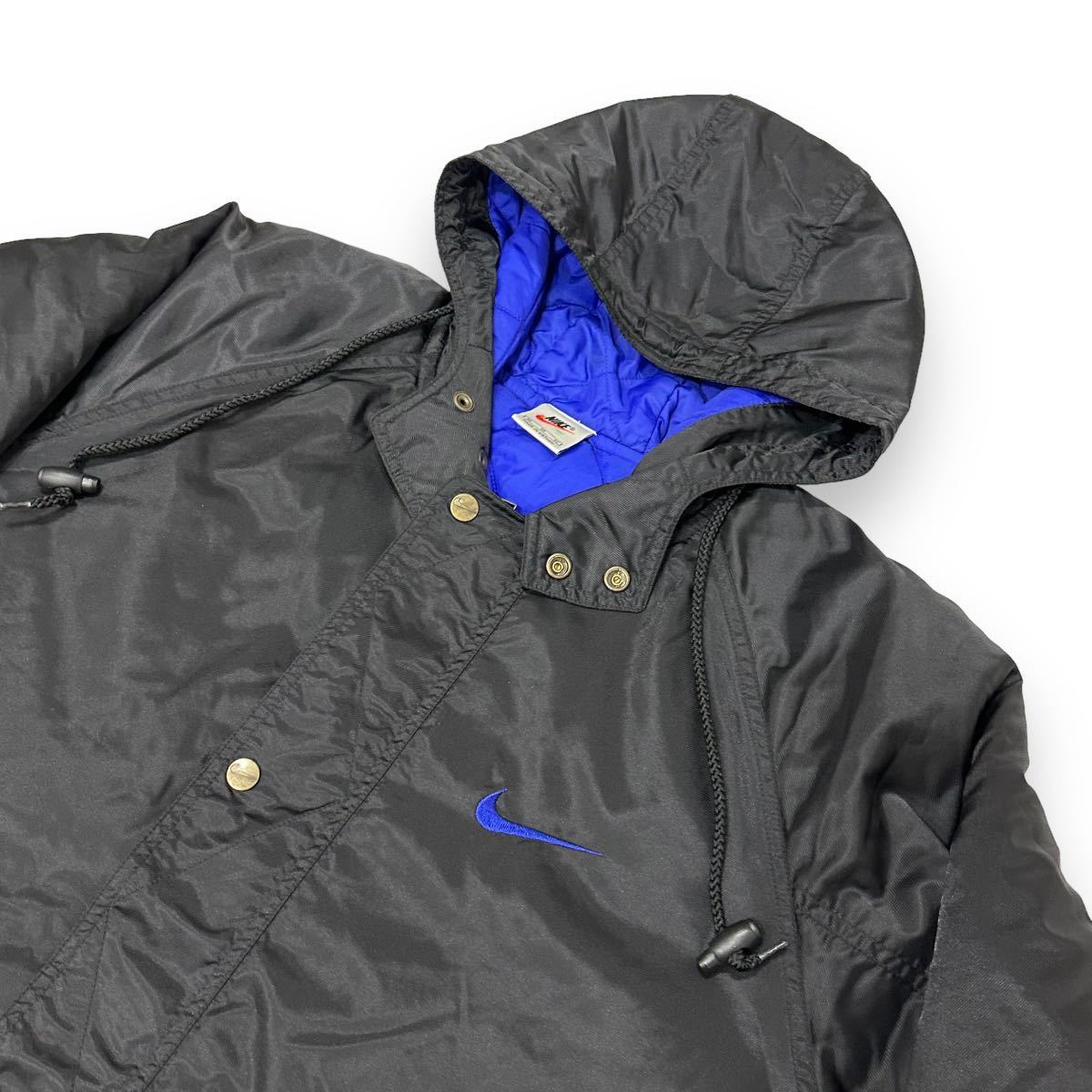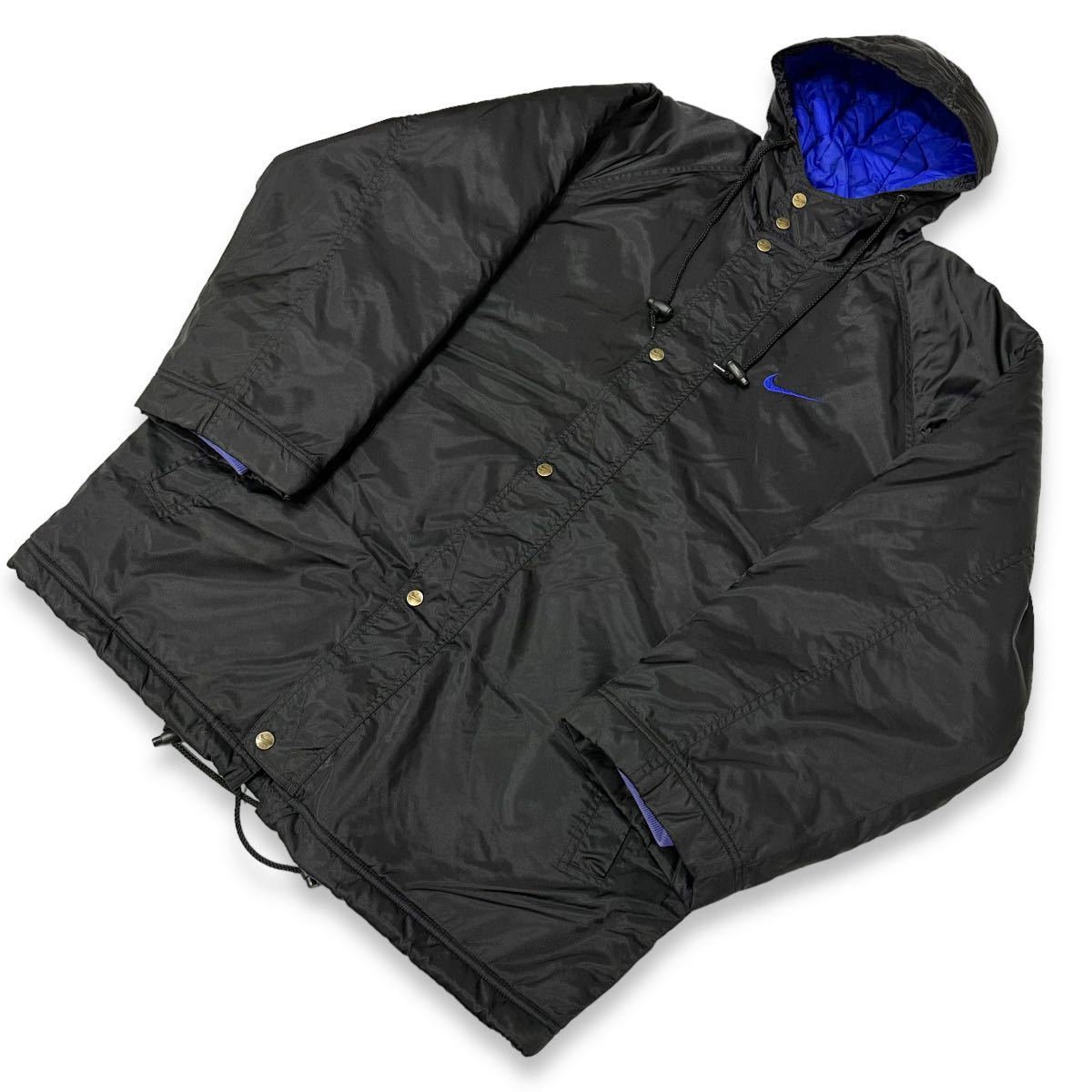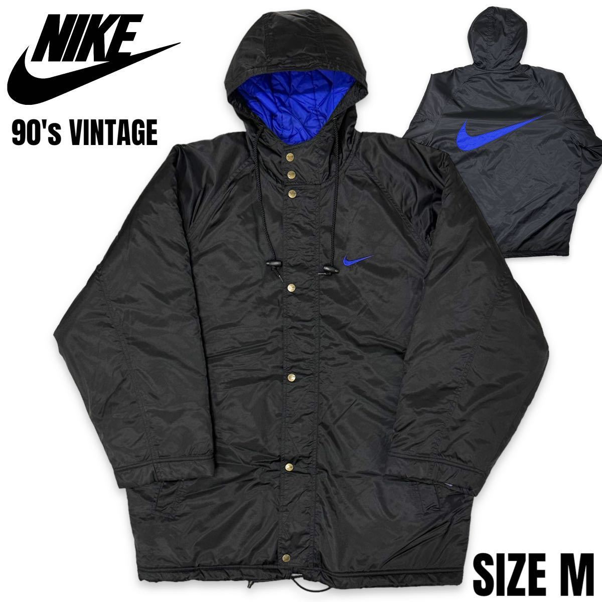 希少■NIKE (ナイキ) 90s 銀タグ ヴィンテージ BIG SWOOSH ビッグスウォッシュ ロゴ刺繍 ナイロン ベンチコート 中綿 ジャケット 黒青 M