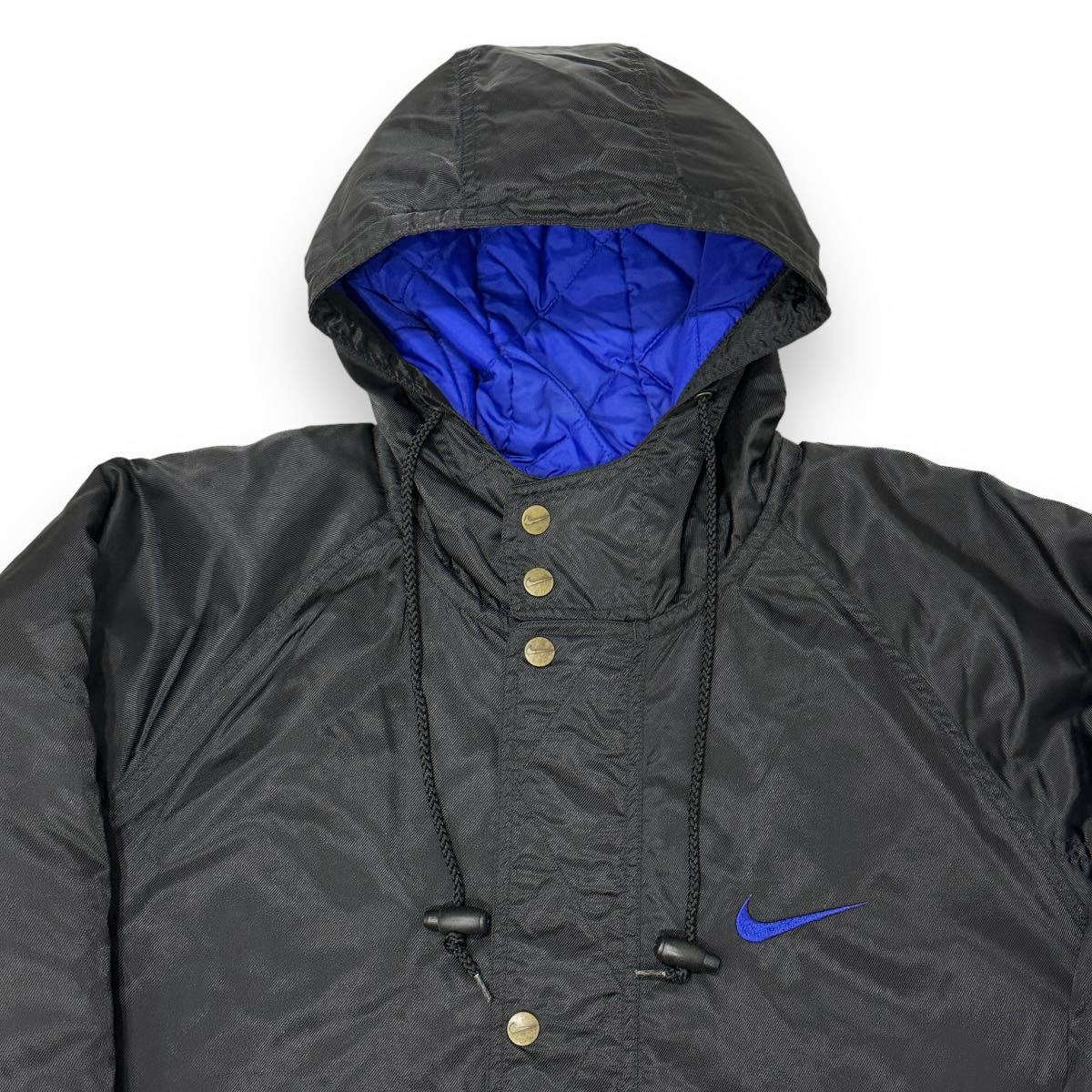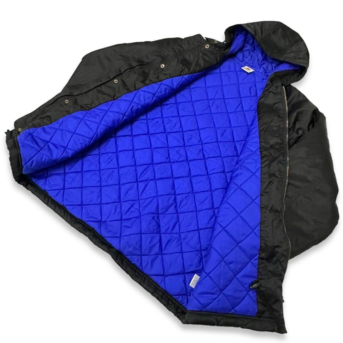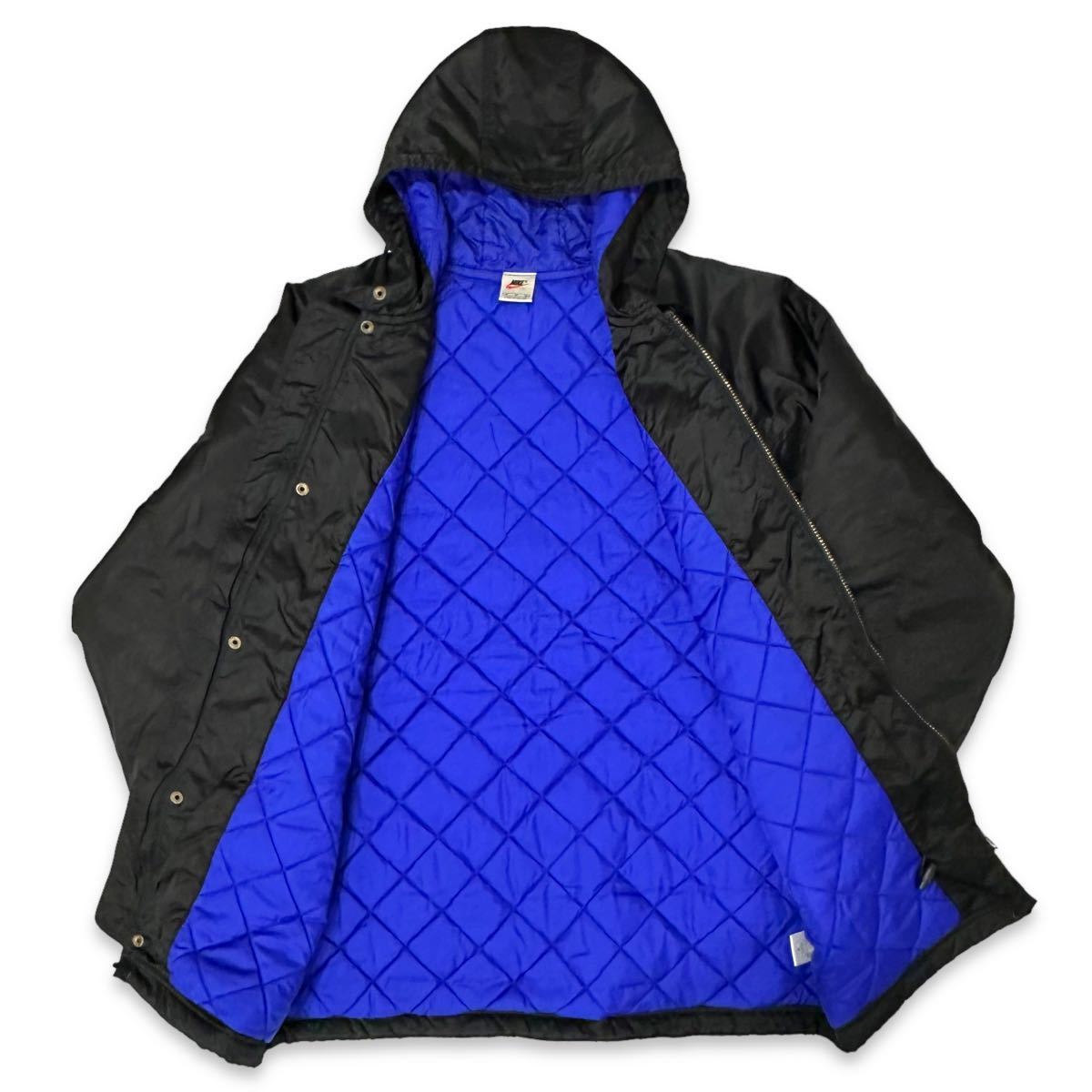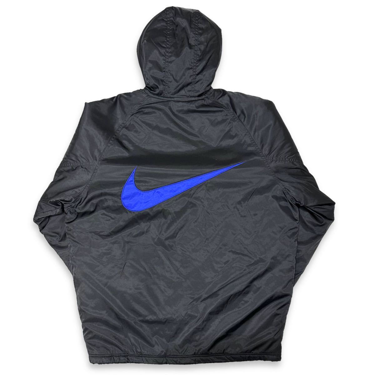 NIKE (ナイキ) 90s 銀タグ ヴィンテージ 中綿入り BIG SWOOSH ビッグスウォッシュ ロゴ刺繍 ナイロン ベンチコート ジャケット 黒青 (ブラック/ブルー) M