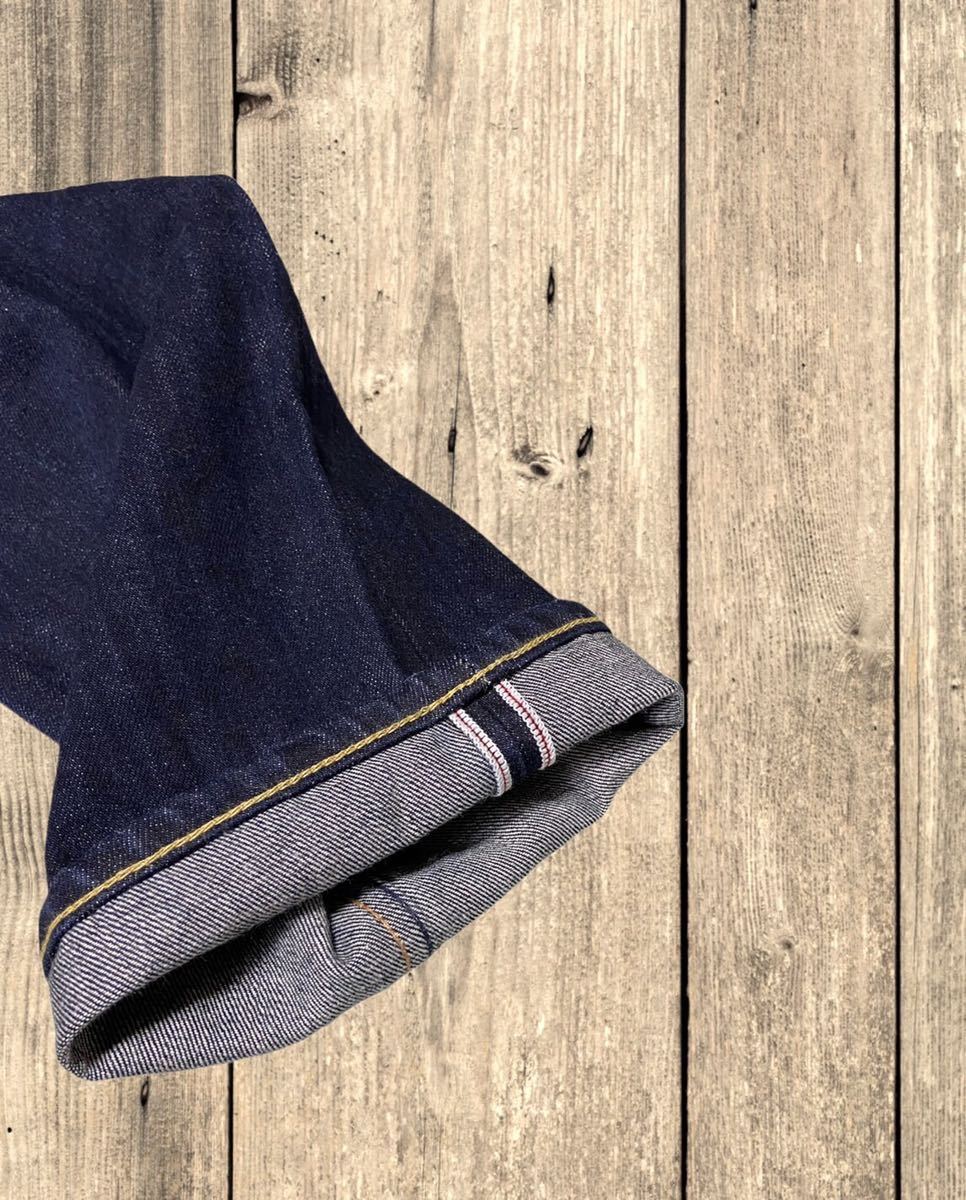 ディテールは50年代のヴィンテージをベースに、生地は13ozデニムを使用し、大きめのバックポケットにアーキュエット、牛革パッチ、更にヴィンテージデニムに見られる赤耳のアウトシームをホワイトとレッドのステッチにより表現しています。