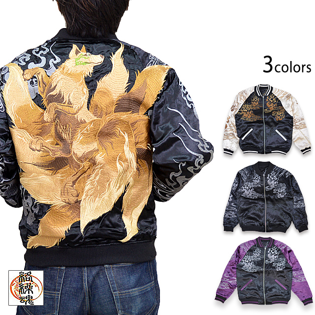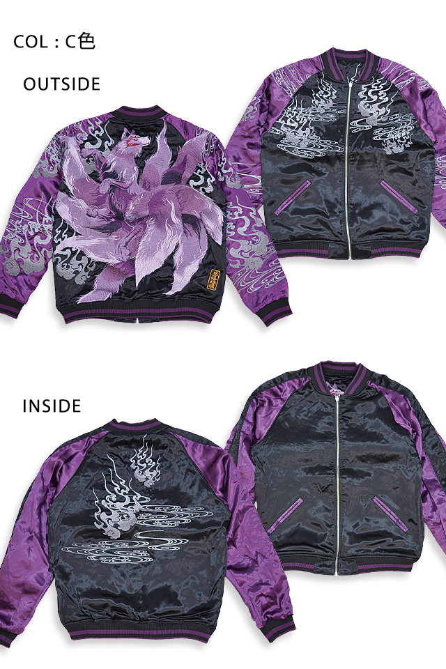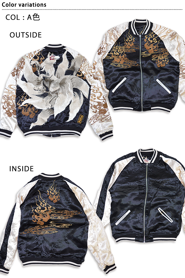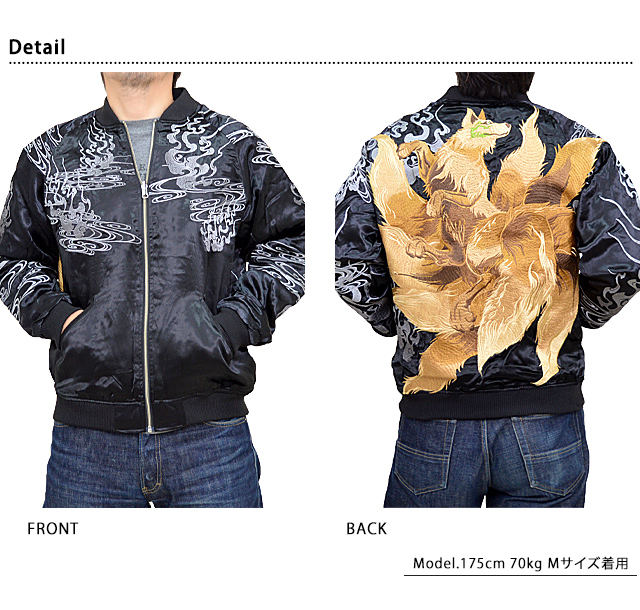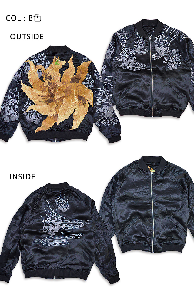 絡繰魂さんから「火炎舞踊九尾スカジャン(224055)」のご紹介です。 重みを感じる程の刺繍量が魅力的な絡繰魂から、最新作のスカジャンが登場しました。 今回モチーフの主役に採用されたのは、近年人気を博している九尾。 表面はしっかり柄の入ったスカジャンですが、対象的に裏面はシンプルに仕上げ、メリハリを付けました。 ボディーにはレーヨンサテンを使用し、ドレープや陰影がくっきりと現れています。 | ||||||||||||||||||||