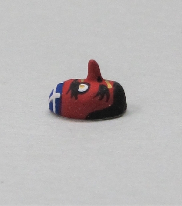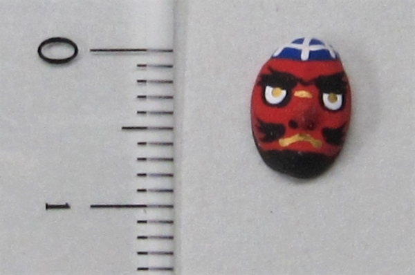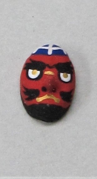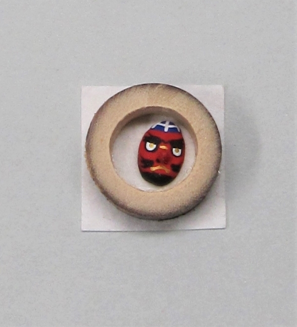 ミニチュアお面。 サイズ全長約1cm。 素材は紙です。 和紙と木で作った枠が付属しています。 ミニチュア工芸家森音広夢氏の平成14年度の作品です。 ひとつひとつ手作り、手書きですので フォルム、表情、模様に違いがあります、 ご了承ください。