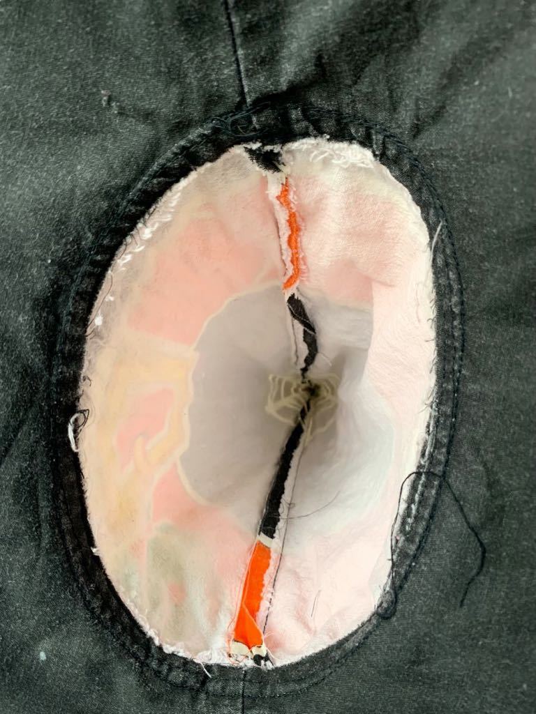 ツバや本体に芯は無く、コットン素材を円錐型に縫い合わせ、ツバを付けた物です。
