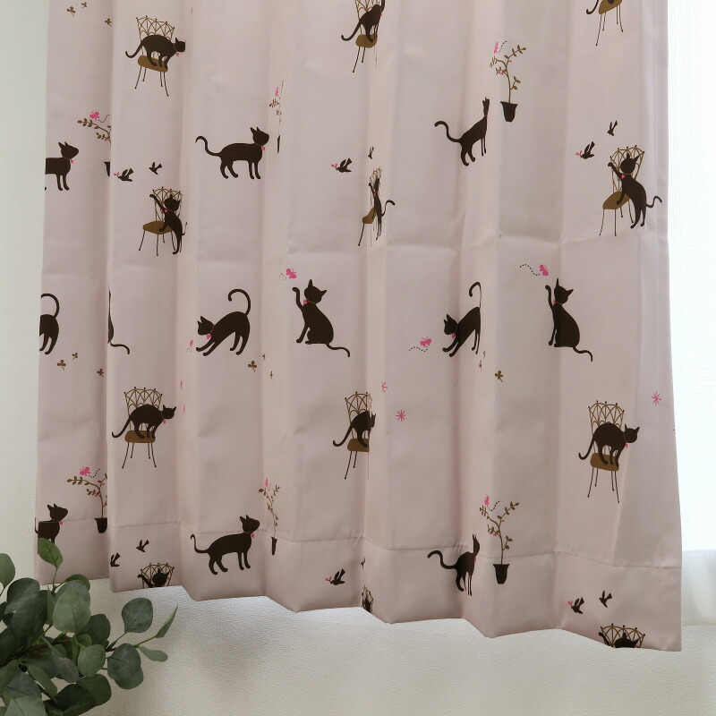 遮光カーテン かわいい猫柄 ピンク 幅200cm×丈90cm1枚 日本製 プリーツが綺麗な形態安定加工