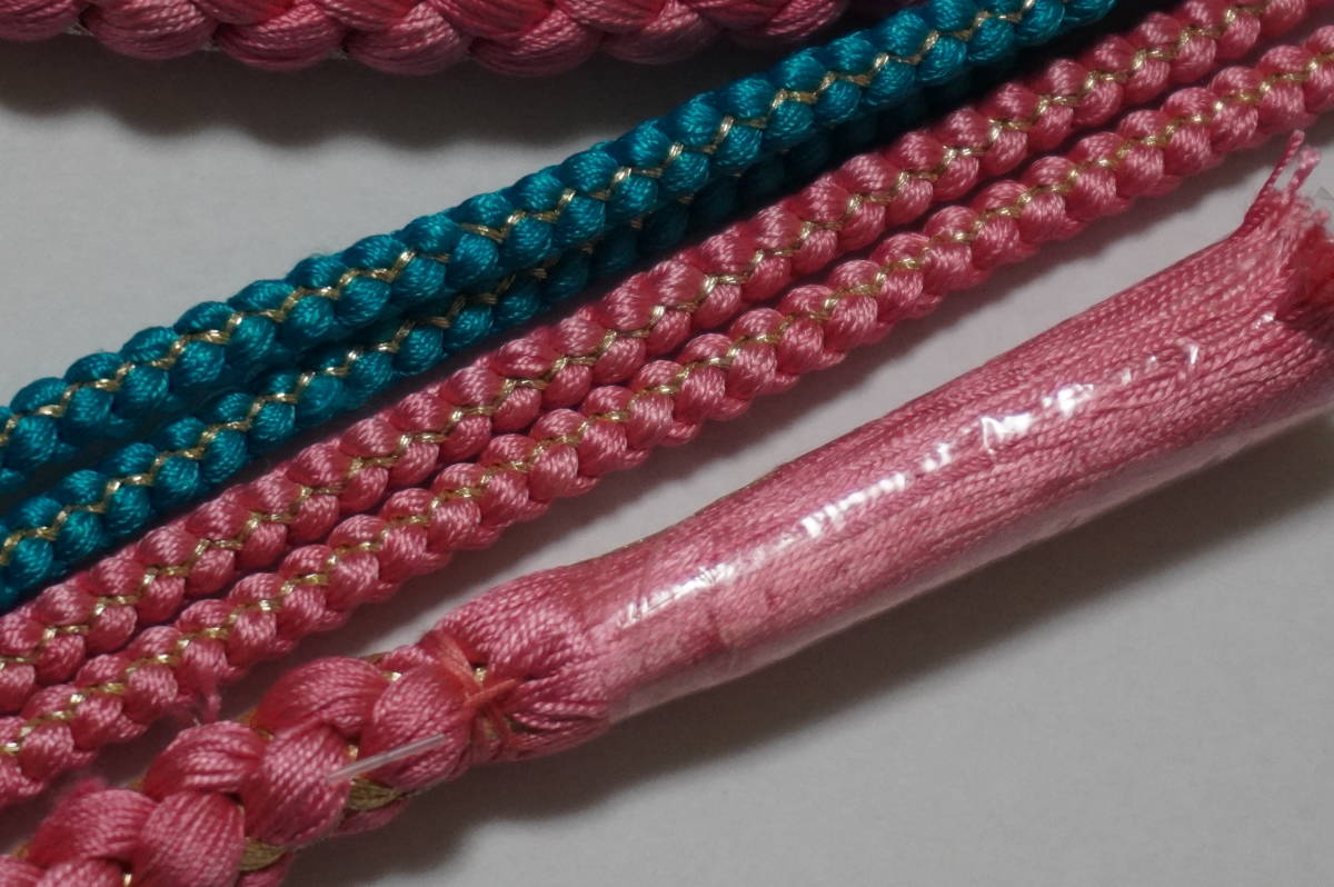 (特価)飾りつき丸帯締め 絹100%(含、金属糸使用) 飾りつき丸帯め。新品処分品。桃色 金色糸の編みこみアリ)で途中から4本分かれ、飾り玉つき(モニターにより、濃く、または薄くっている場合などありますので心配なかたは質問をしてください)。 巾約10mm 。長さ房を入れないで約155cm(M寸表示)