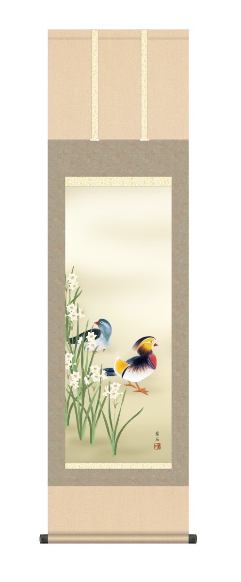 掛け軸 高精細巧芸画 純国産掛け軸 花鳥画 高見 蘭石 「鴛鴦」 尺三 オニックス風鎮 防虫香サービス