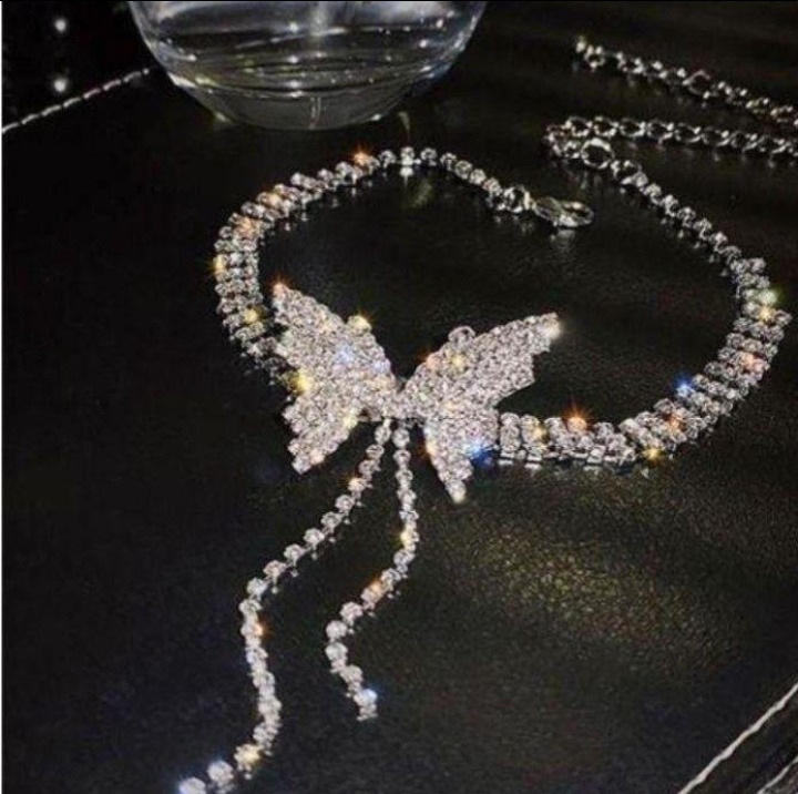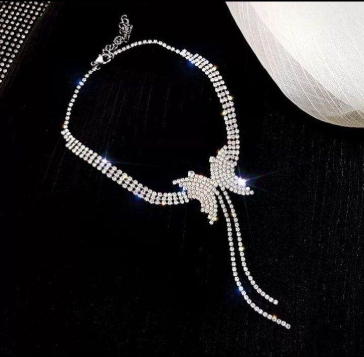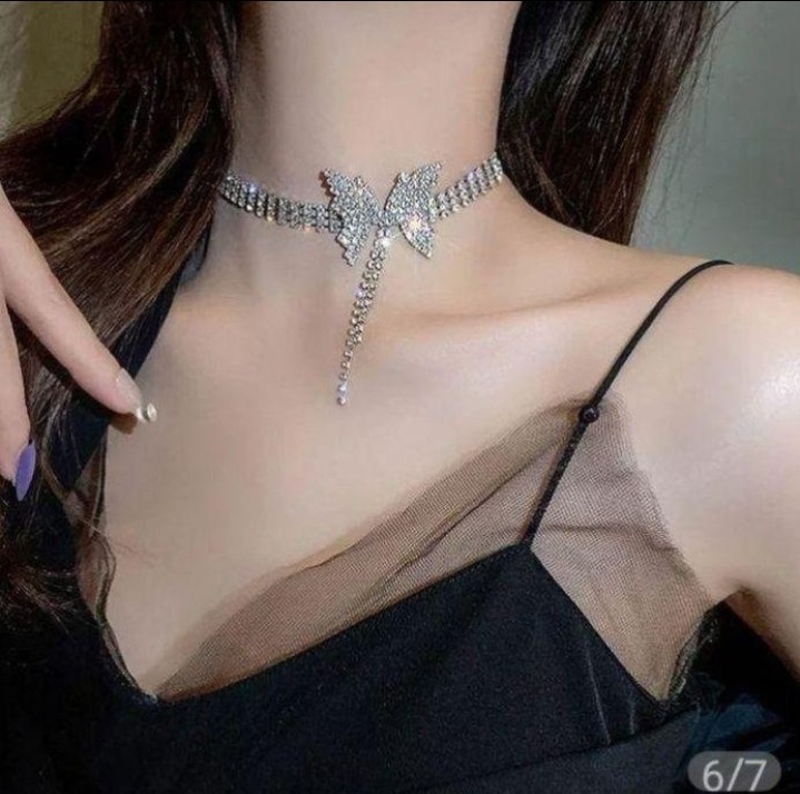 ゴージャスな輝きを放つラインストーンがふんだんにあしらわれた、大胆でカワイイ蝶モチーフが特徴のチョーカーです。
