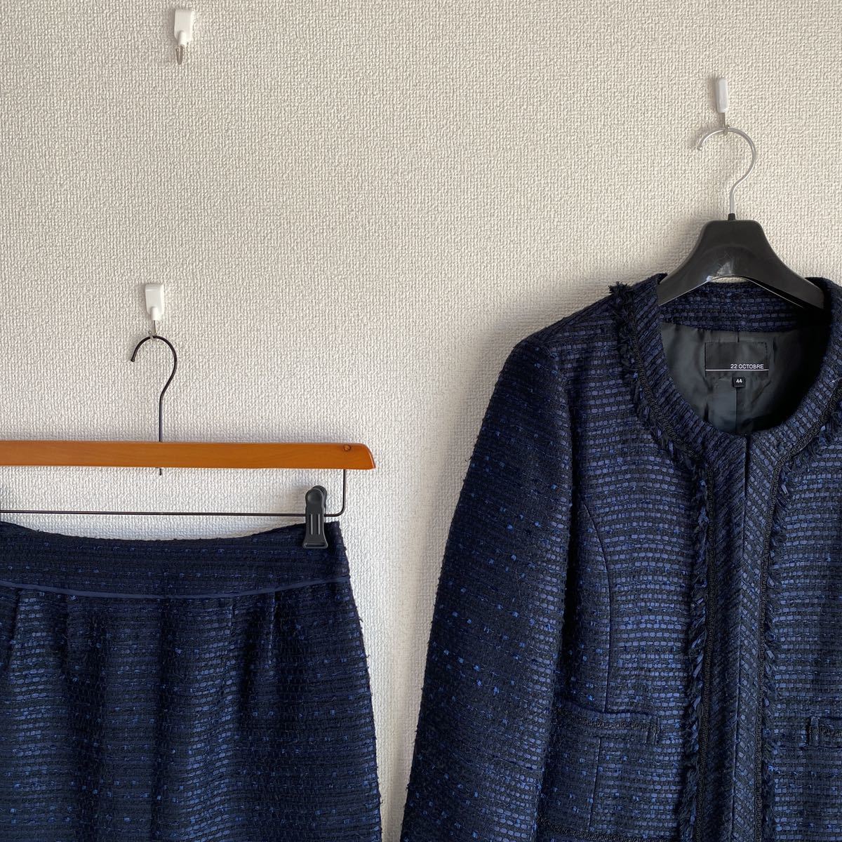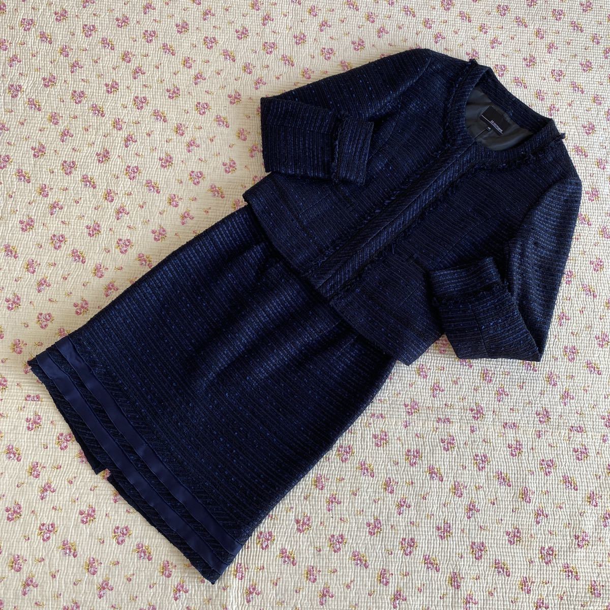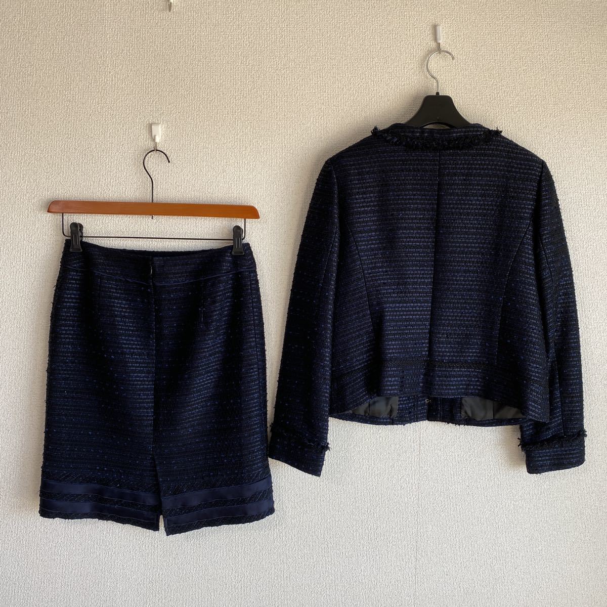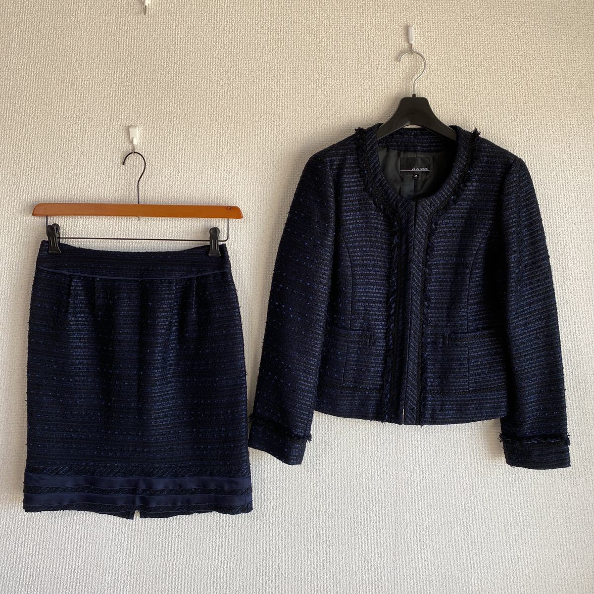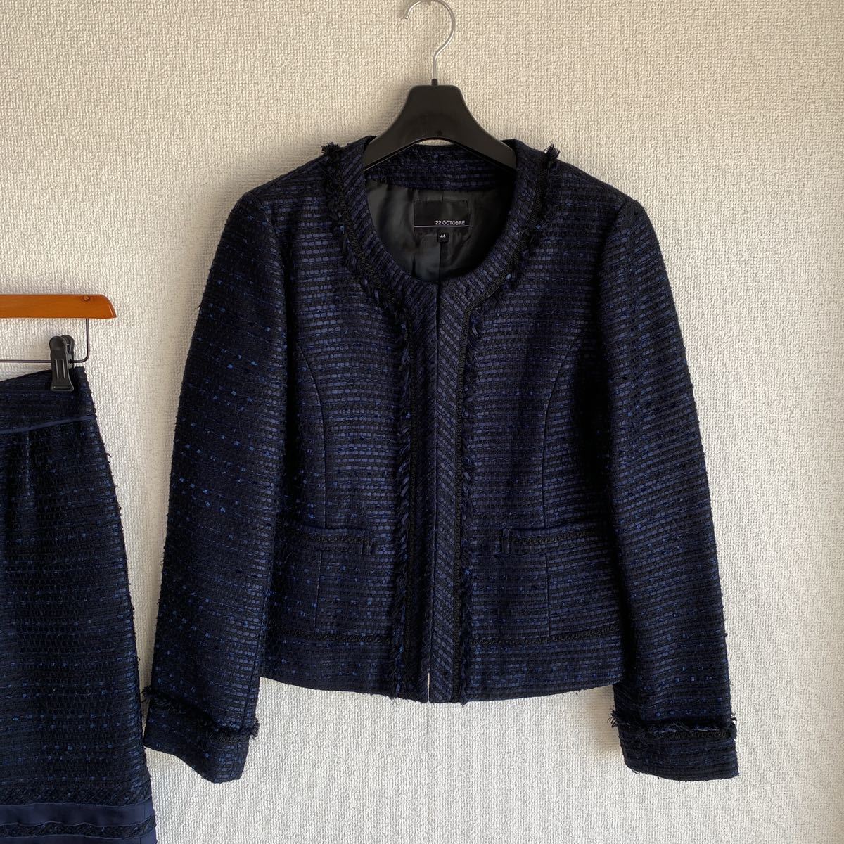 ご覧いただきありがとうございます。染み、汚れのない、自信を持ってお勧めできる、良いお品を提供致しております。22オクトーブル ノーカラー スーツ 上44下40 W68 濃紺ツイード DMW でございます。22オクトーブルの上質ノーカラージャケットスーツです。上品で、清楚な雰囲気で着こなせます。面接、ビジネス、学校行事にお勧めです。お色は画像でご確認下さい。実際のお色が良く出ています。濃紺ツイード生地です。総裏仕立てです。フロントはホックが6つ付いています。袖口にボタンは付いていません。ジャケット、外ポケット×0。内ポケット×0。ノーベント。スカート、センターバックファスナー、ポケット×0。スリットあり(背面、約16センチ)。脇染み、汚れ、ほつれのない、きれいなスカートスーツです。