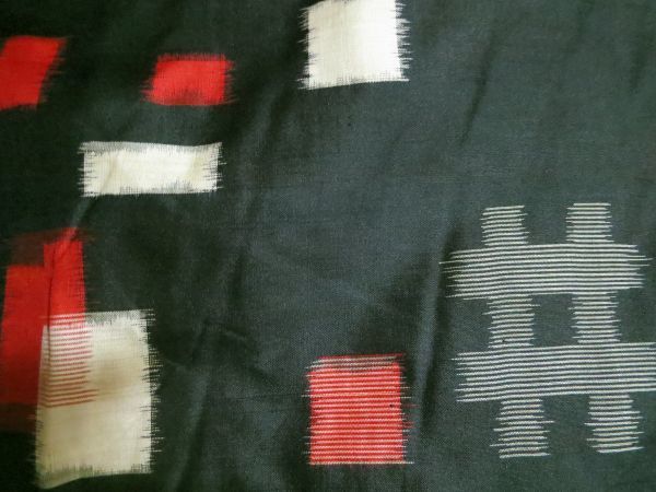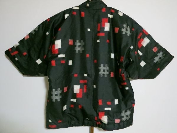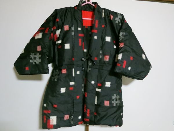 1点物 半纏 温かい 綿入り 黒x赤 絣柄 大正柄 はんてん ハンドメイド 手作り レトロ 着物リメイク オリジナル 鬼滅の~ 受験 夜更かし