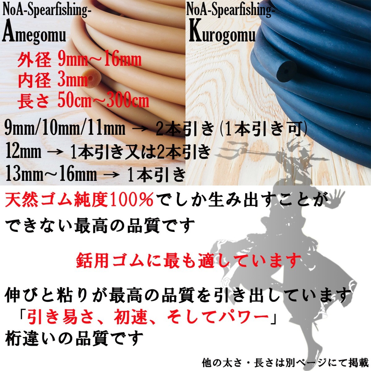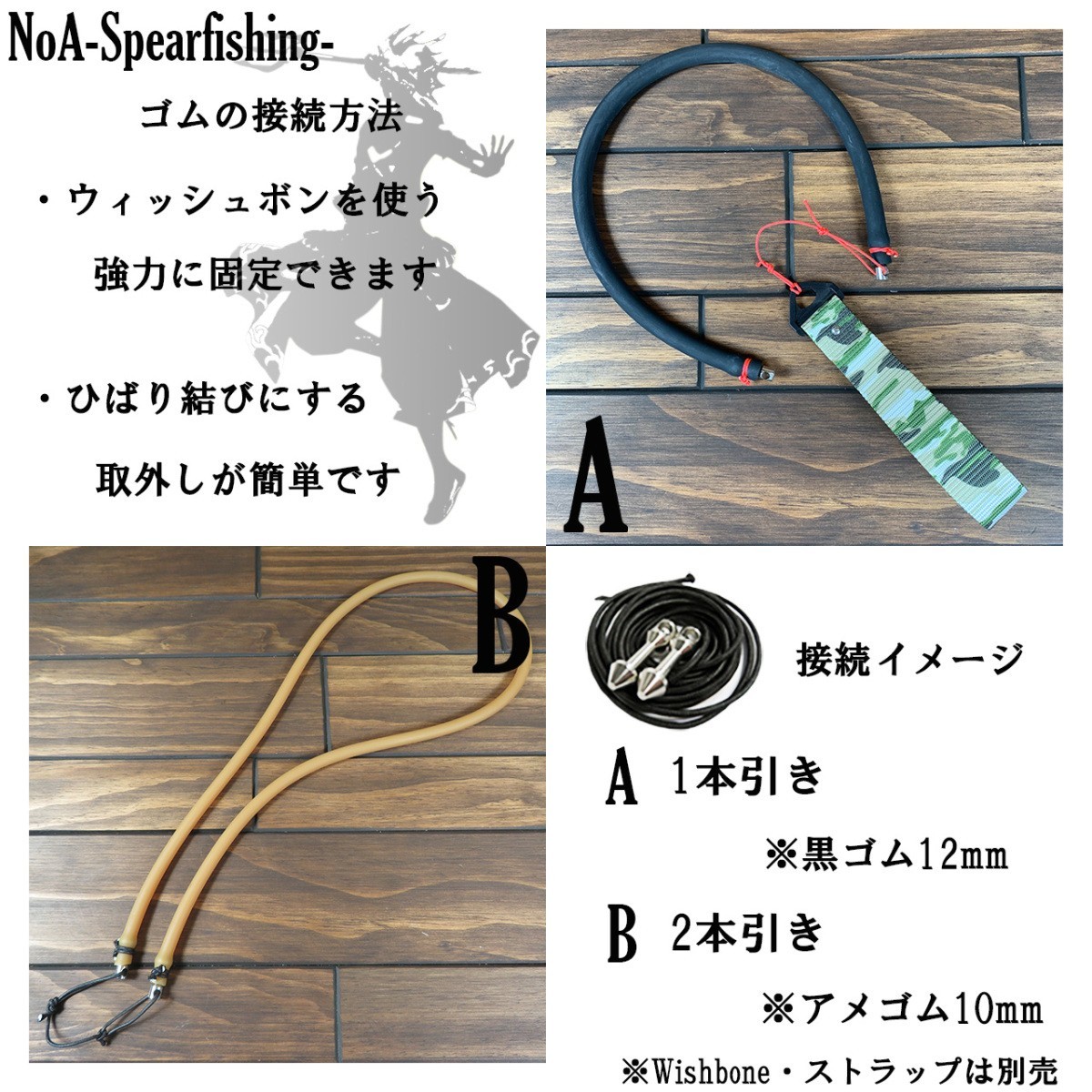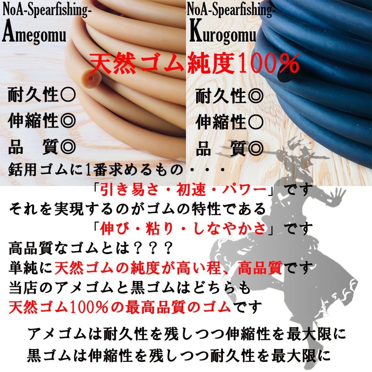 | 特徴 | ・肉厚6mmの2本引き専用ゴム ・天然ゴム100%の黒ゴムを採用 ・伸びと粘りが強く、初速・威力がスリングゴムに比べ圧倒的 (スリングゴムは断面で見ると外側と中身の色が違うことが多いです、ゴムに石油やカーボンなど伸びに関係のない不純物を混ぜるため) ・銛用ゴムに最適 (引き易さ・速さ・伸び・威力) ・ゴムの長さを3倍~3.3倍に引っ張ると最高威力を発揮します |
