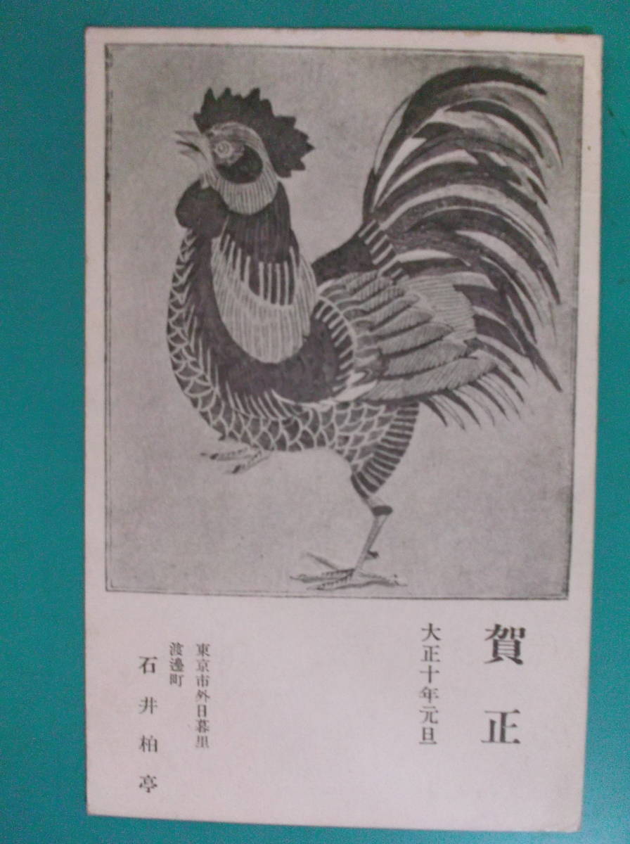 ⑨    年賀状 大正十年 賀正 東京市外日暮里渡邊町より   京都守護院熊野神社東入宛て  切手剥がれ