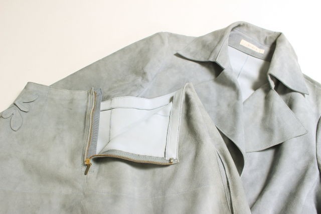 【状態】汚れ・シミ→所々に変色あり。(特に★ジャケット:襟、★スカート:右ウエストサイドに目立ちます。)備考→スカート:ウエストの数ヶ所に挟んだような跡あり。天然皮革のため動物本来が持っていた傷痕やシワ、毛穴、汚れ等がございます。また、パーツにより若干の色ムラがございます。