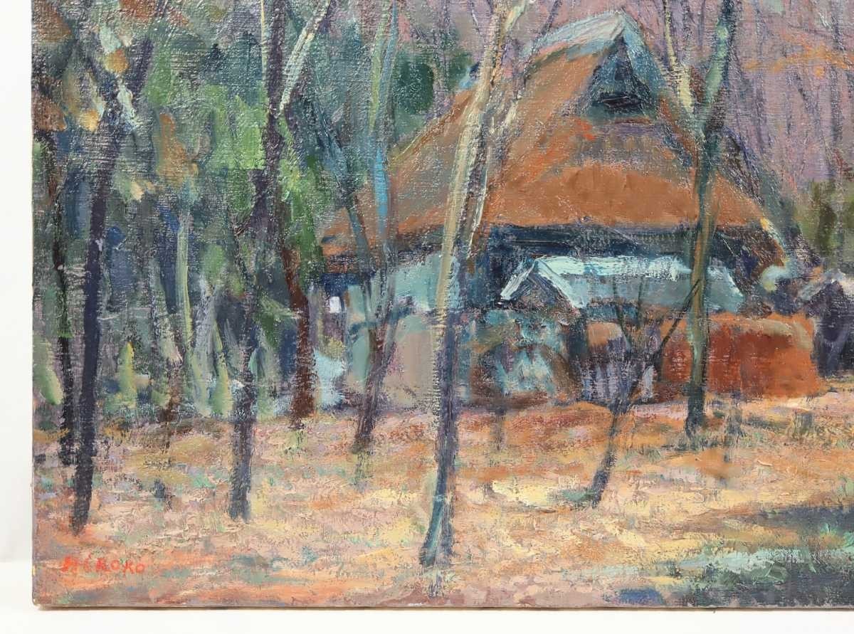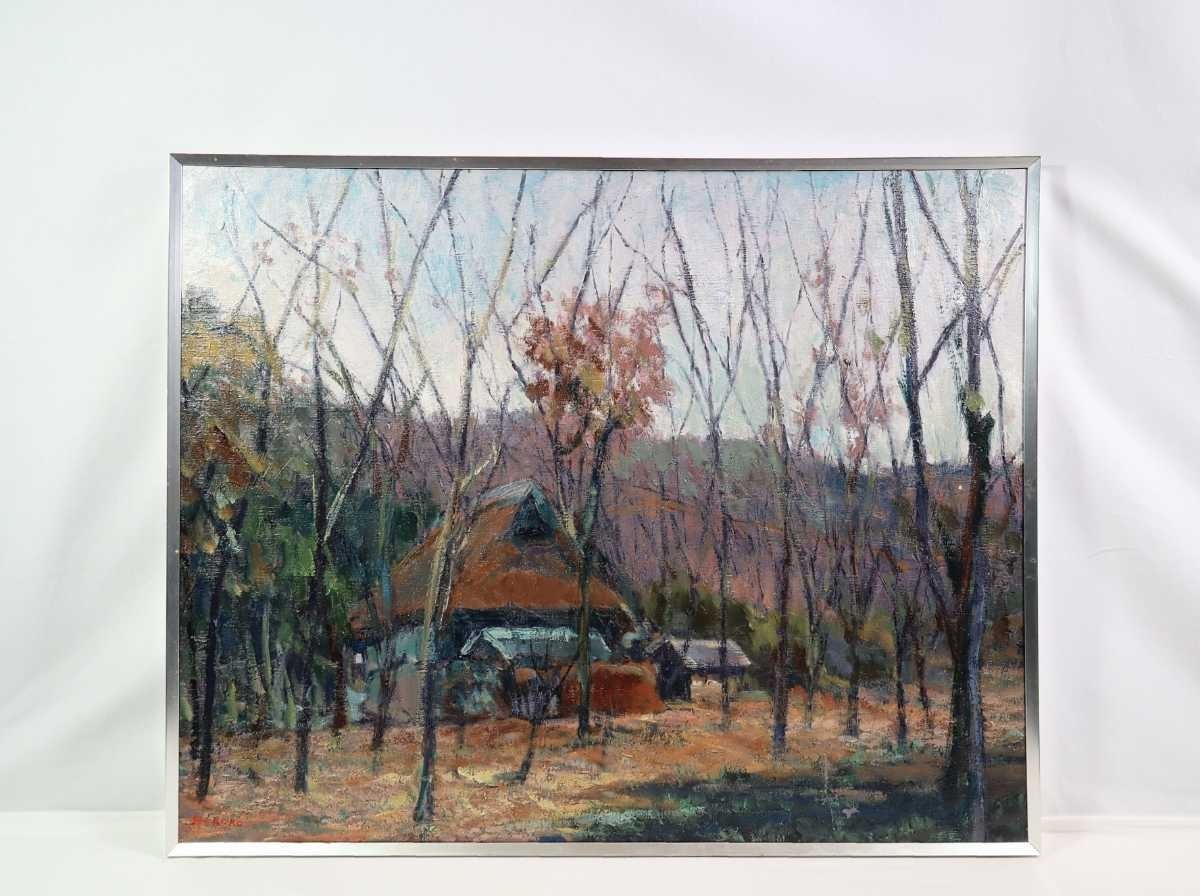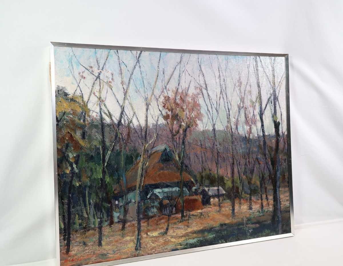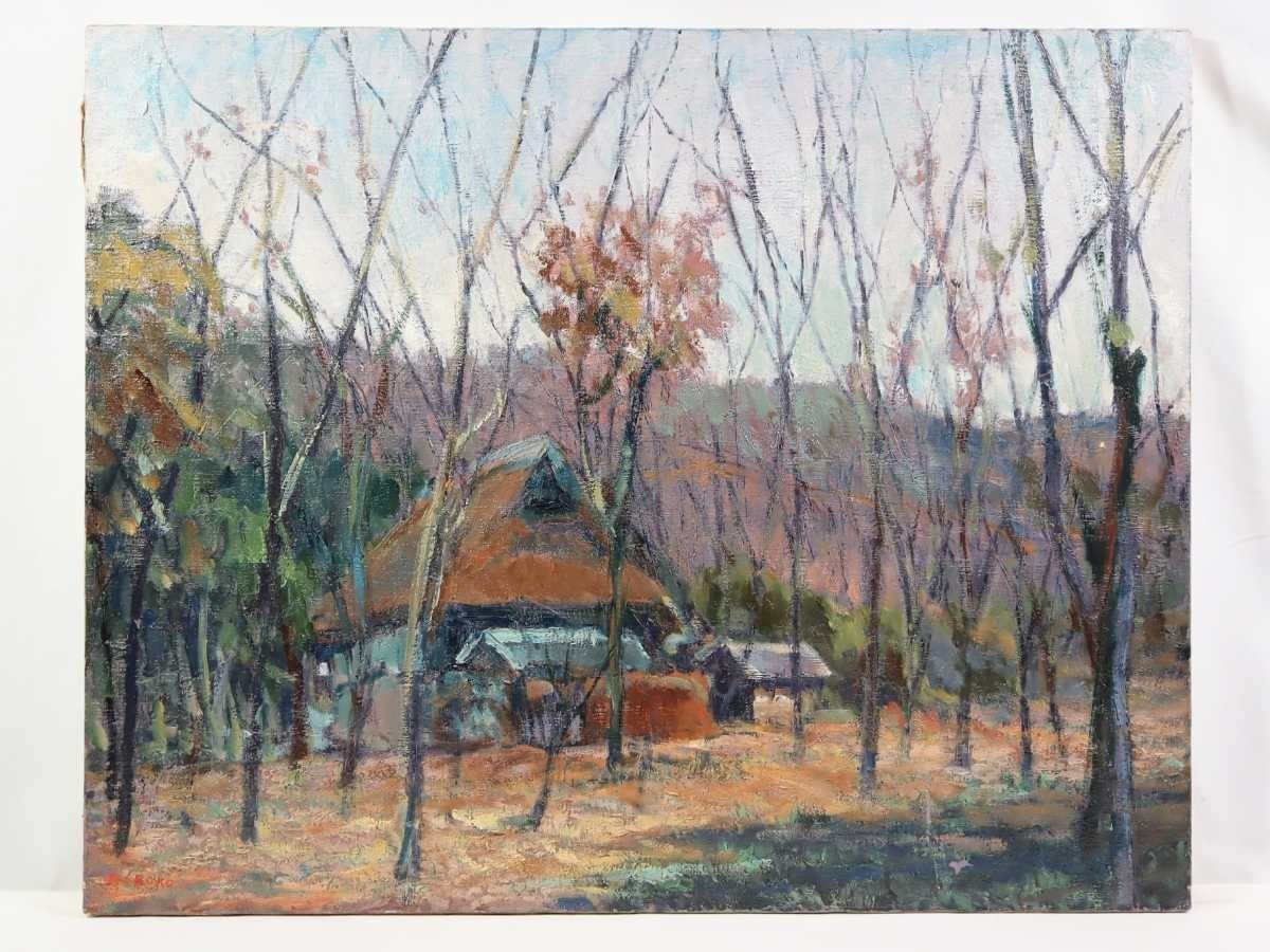 真作 鈴木宏子 大型油彩「里山の秋」画寸 91cm×73cm F30 季風会同人、朱葉会会員 奥深い山里の小さな古民家と周囲の雑木林の秋景 5626