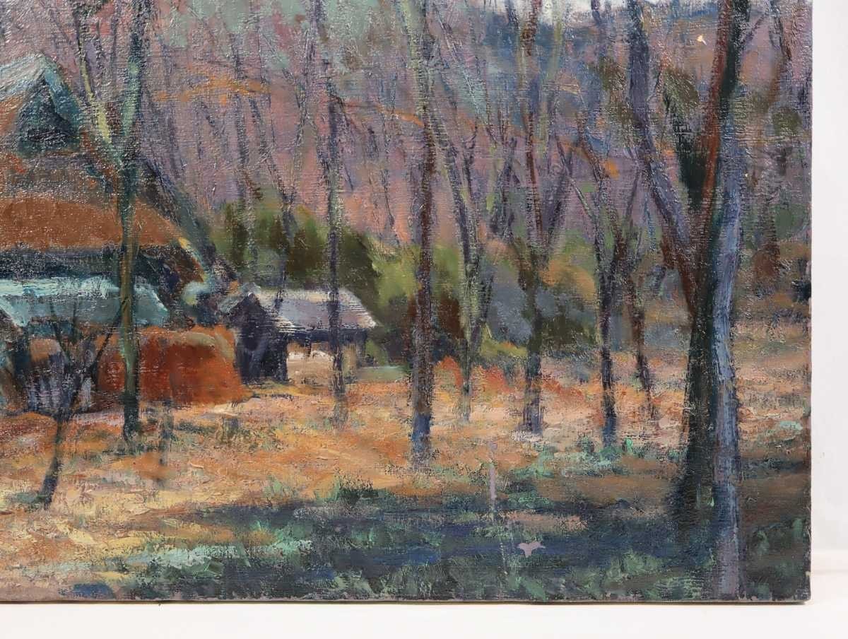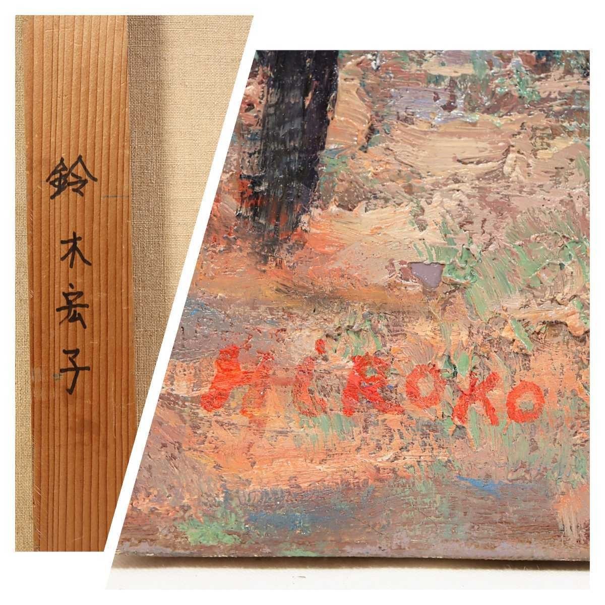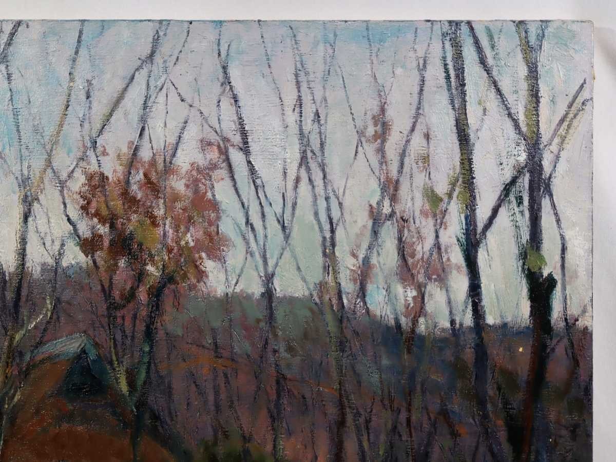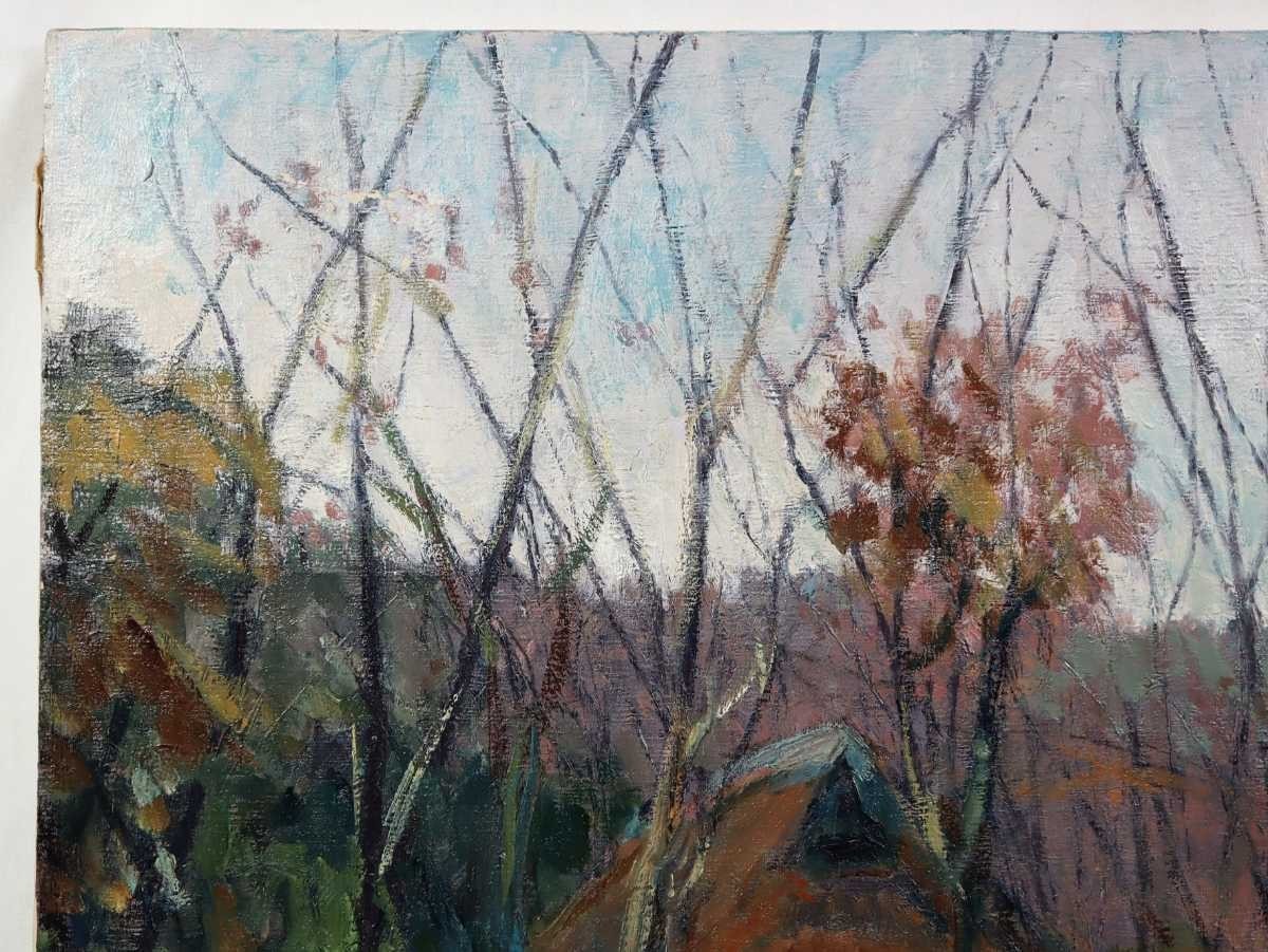 真作 鈴木宏子 大型油彩「里山の秋」画寸 91cm×73cm F30 季風会同人、朱葉会会員 奥深い山里の小さな古民家と周囲の雑木林の秋景 5626