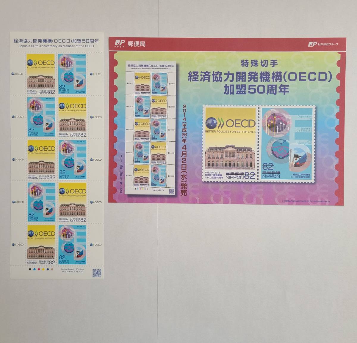 「未使用切手+解説書」経済協力開発機構(OECD)加盟50周年 82円切手 1シート 平成26年4月2日発売 2014 日本 JAPAN R410