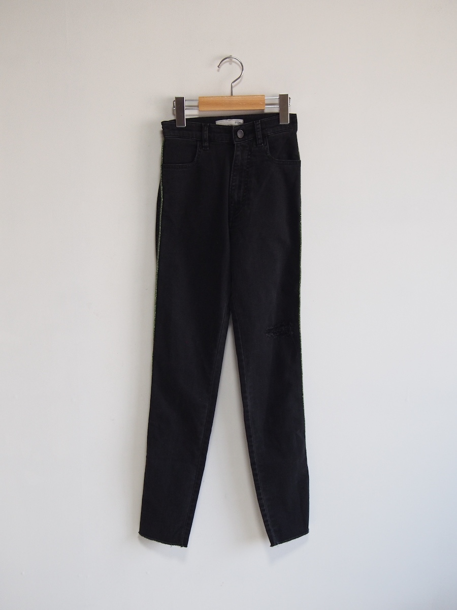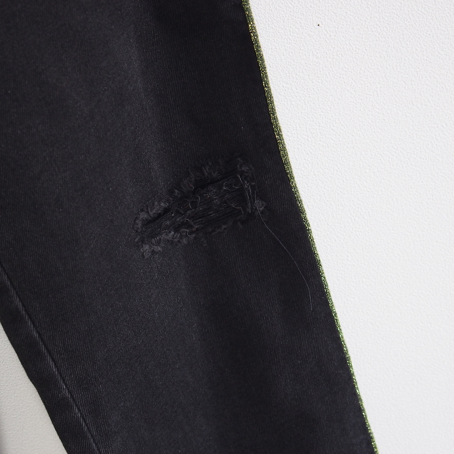 程よいウォッシュ感のあるブラックで、ラメ入りのサイドのライン入りの存在感が光る仕上がりです。 きれいめな表面感と、ラフな雰囲気に仕上げられたの裾のバランスがおしゃれです。 ダメージ加工もさりげなく、少し深めの股上で腰回りに安心感があります。定価39600円です。