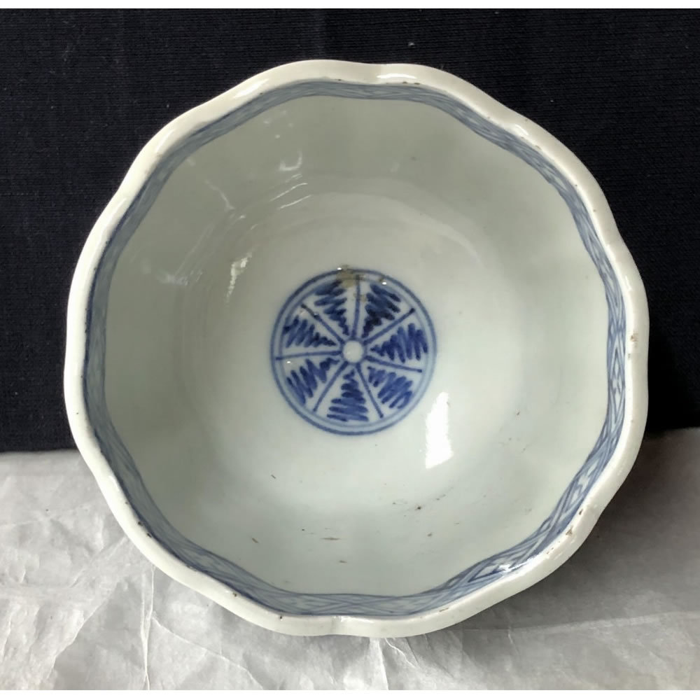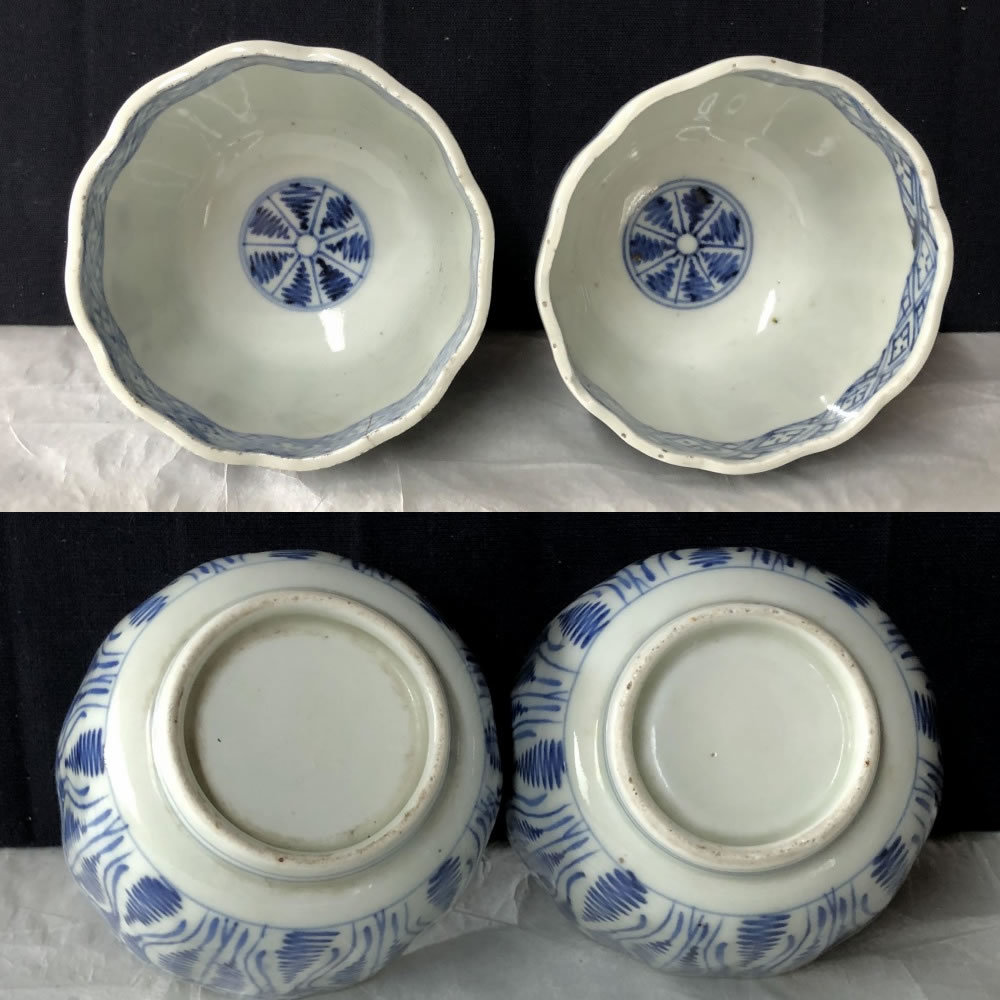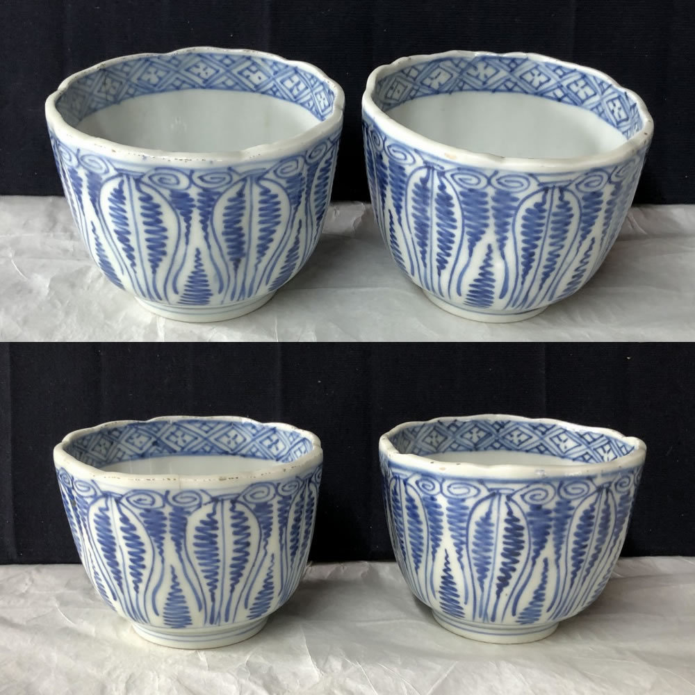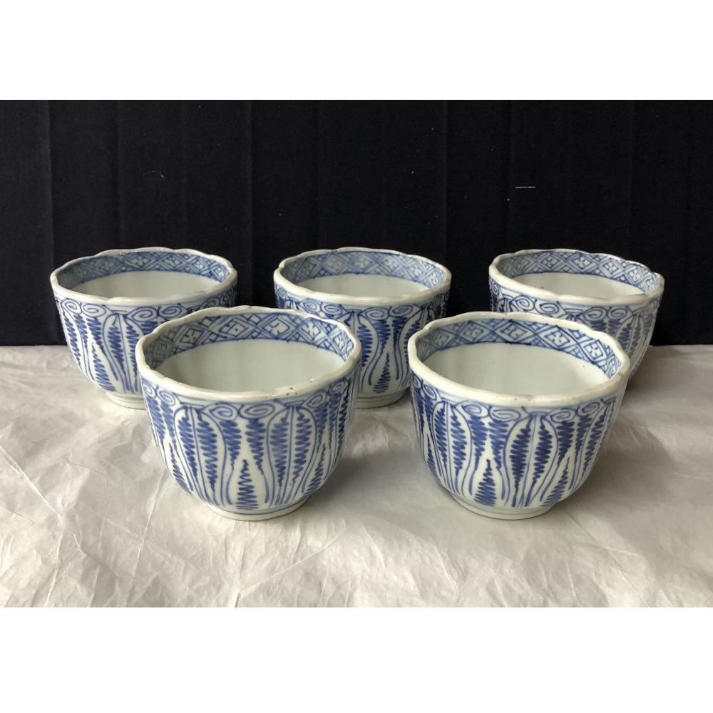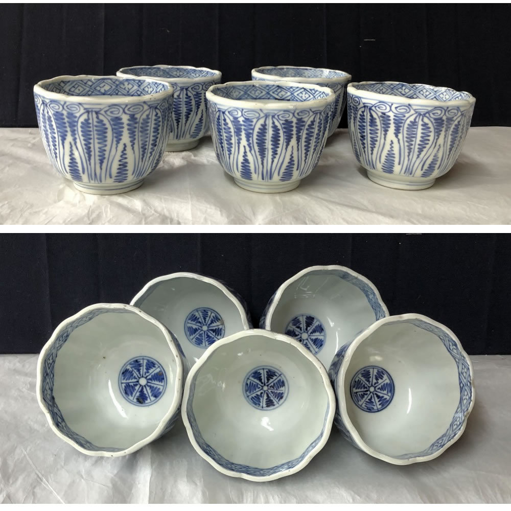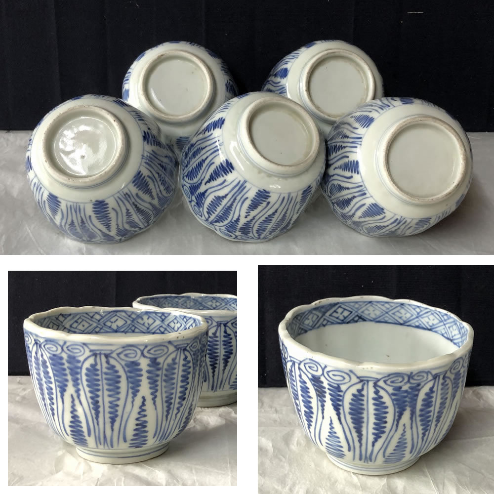e2028 古伊万里 染付 中猪口 5客 よろけ紋 蕎麦猪口 そば猪口 茶碗