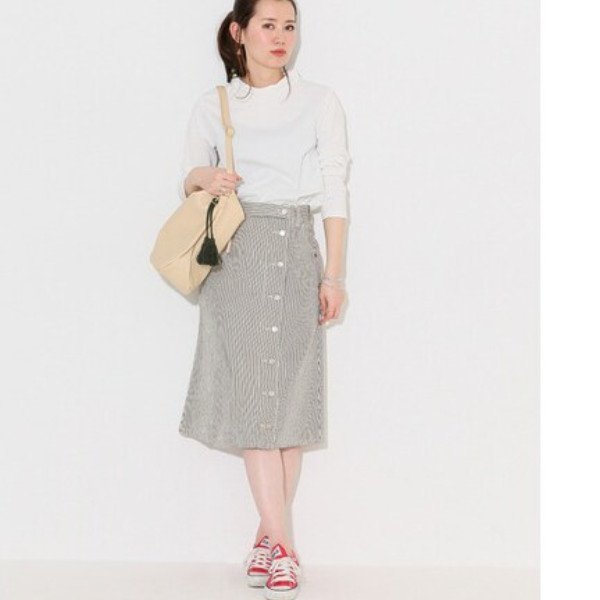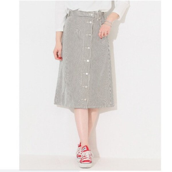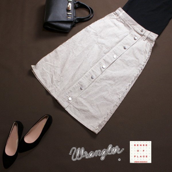 リーバイス、リーと共にアメリカの3大デニムブランドに挙げられるWranglerとのコラボ商品です。コットンデニム生地、釦にロゴ、ミモレ丈のお洒落な1枚です。