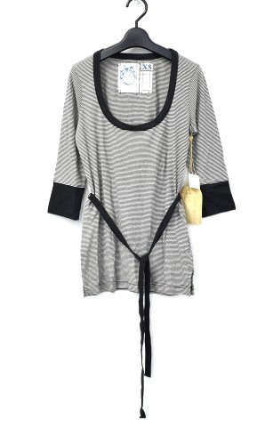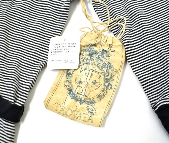 ・素材:コットン100% ・カラー:ブラック/ホワイト ・サイズ:XS 実寸 肩幅 約33cm・身幅 約42cm・着丈 約63cm・袖丈 約41cm (多少の誤差はお許しください) 2002年に設立、同年にロサンゼルス・プールトレイド賞TOP5ブランドに選ばれ、「バーニーズニューヨーク」や「ロンハーマン」などの人気セレクトショップ等でも取り扱いのある「TROVATA(トロバヴァータ)」。 トロヴァータの特徴は、ヴィンテージから影響を受け、トラディショナルなスタイルとストリートの要素を組み合わせたところにあり、プレッピースタイルに西海岸のサーフテイストをミックスしているため、ニュープレッピーとも表現されるスタイルで、ハリウッドスターなどが好んで着用していることでも知られています。 こちらは、広めのUネックや長めの袖リブ、ウエストの紐が特徴的なボーダーカットソーです。 背中側に見られるタグのステッチがさりげなくアクセントになっています。 保管のみの新品同様。 かなりお値打ちだと思います。この機会にぜひ!。 他にもいろいろ出品しています。 管理番号:041806Y-083100 PD212305-300 ★ |