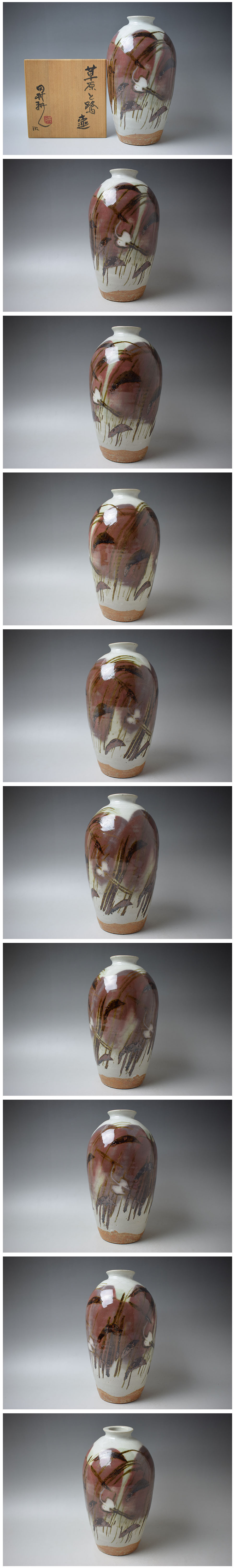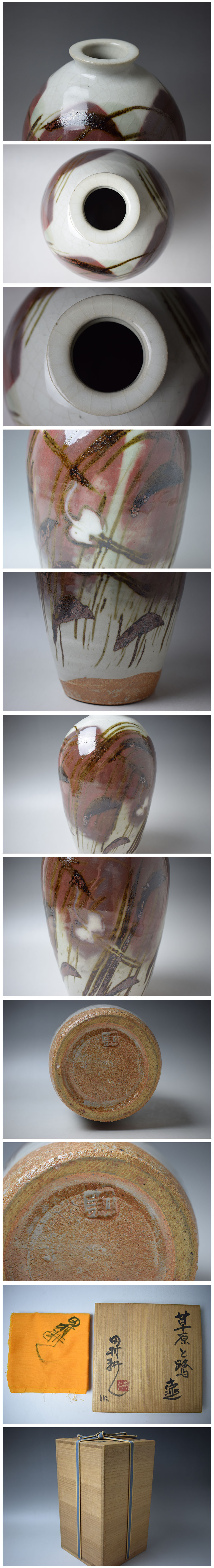 【人間国宝 田村耕一 草原と鷺 壷 共箱 真作保証】