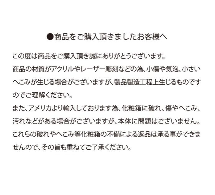 ・当方の発送ミス(商品間違い等)の場合誠意を持って対応させて頂きますが、それ以外の返品・交換等は致しかねますのでノークレーム・ノーリターンでお願い致します。