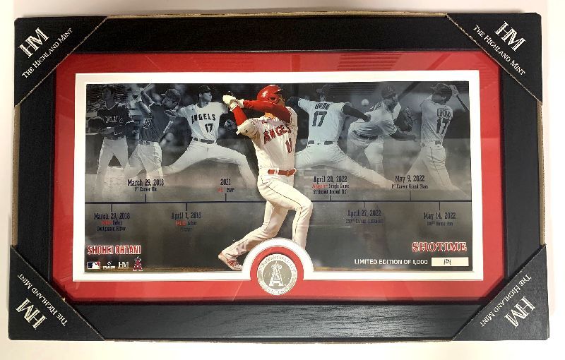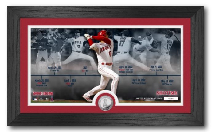 ☆MLB・ロサンゼルス・エンゼルス 2022 大谷翔平メジャー通算100号ホームランを記念し、MLBデビューからメジャー通算100号ホームランまでの主なタイトルを年表にしたシリアル番号入りフォトミントです。
