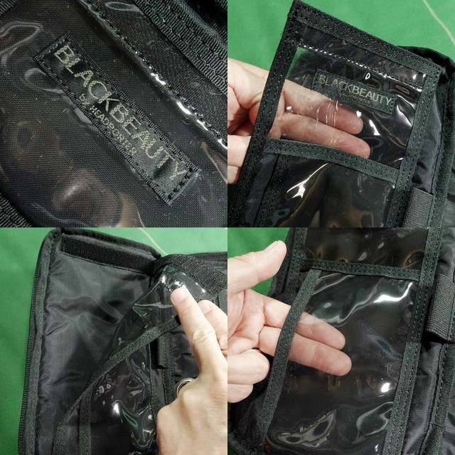 メイン収納部はダブルジッパーで180度開き、左側にはベルクロ留めクリアスリーブ、クリアスリーブ、ペンホルダー1つ。