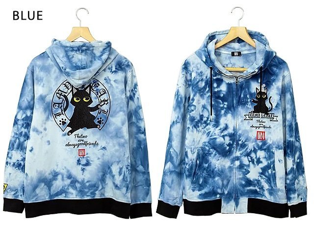 何でもあり、何でもやる新ブランド「LIN」から「スコ座りラミアールのタイダイ染めパーカー(AL-75046)」のご紹介です。 黒猫のLamy(ラミ)とネズミのEarl(アール)。 昨年人気を博したタイダイ染めパーカーから第二弾が登場! 前回のアメカジテイストは打って変わって、今年はストリートなデザインにまとめられています。 ボディーには、軽い羽織り心地の裏毛スウェットを採用。 | |||||||||||||||||||||||||