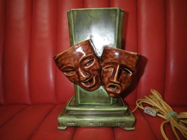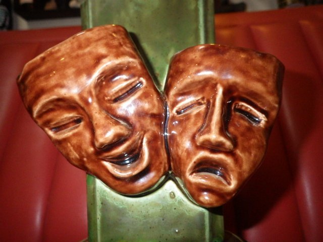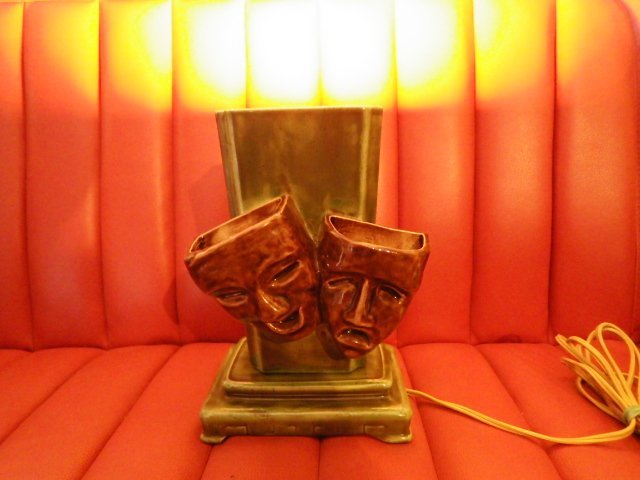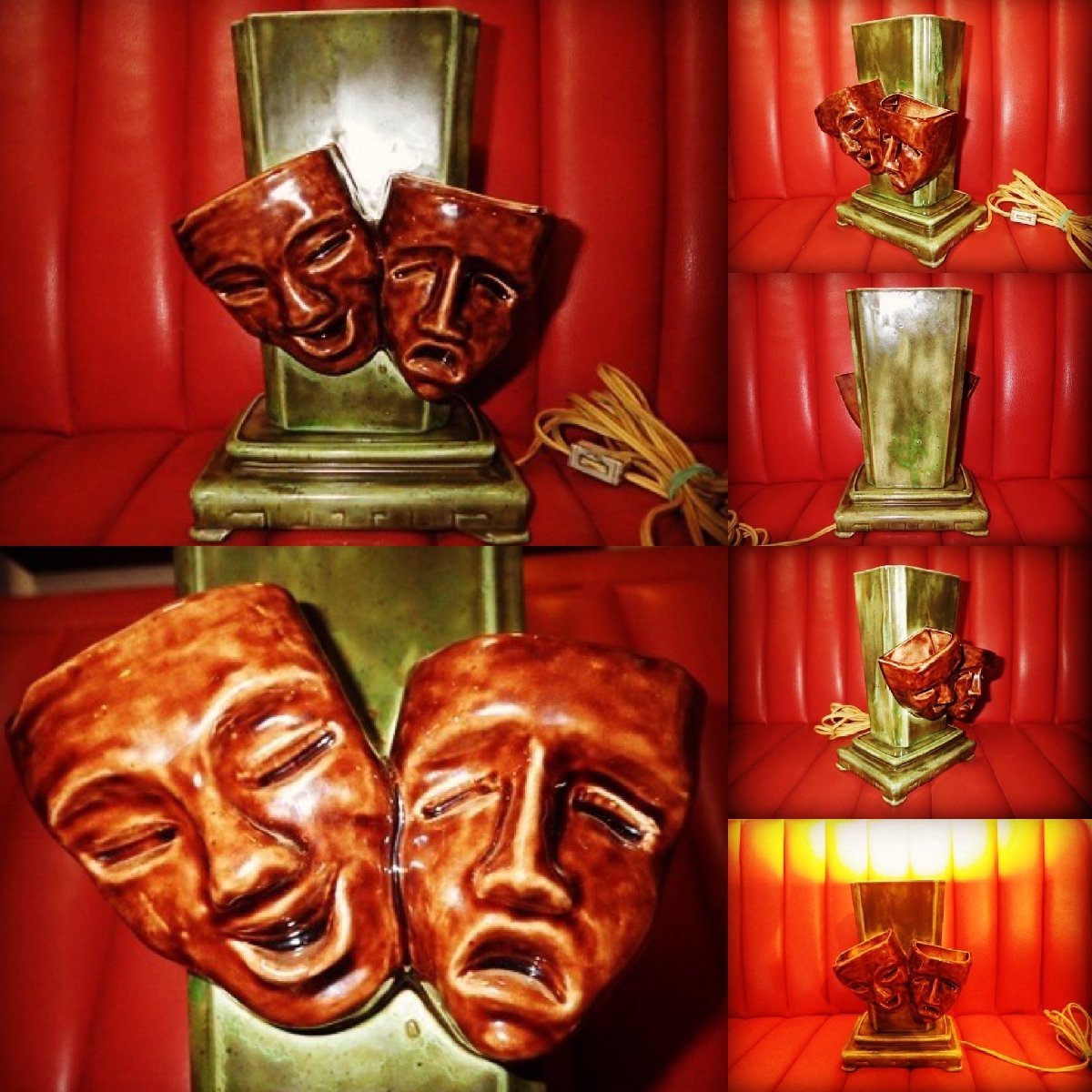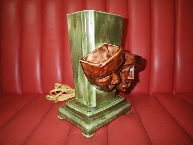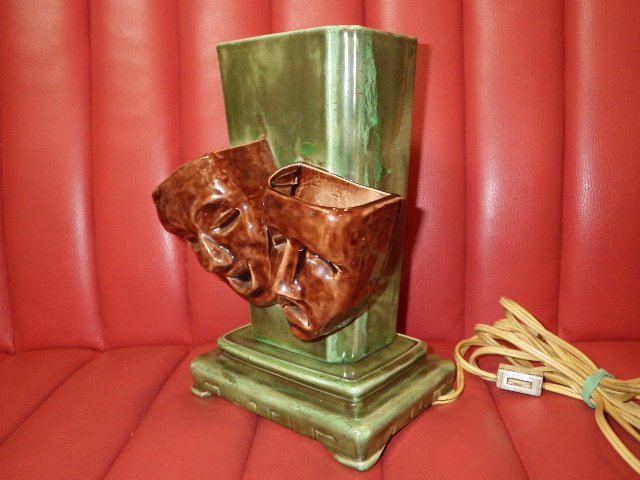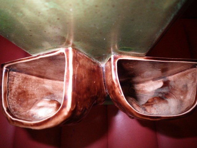 素材はセラミック、サイズはおおよそ、高さ25.5×横幅18.3×奥行き12cmくらいと大きめサイズ、ツーフェイスの頭部がプランターになっている珍しいタイプになりまして、モスグリーンにダークブラウンの泣き笑いのカラーリング、表情も良く、たいへん存在感のあるCOOLな一品です♪
