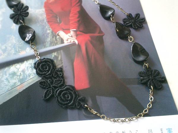 大人のロマンチック(?)黒の薔薇の綿レースとブラックオブシディアンのシックなネックレスです♪ブラックオブシディアンは13×18ミリ位のオーバルツイストです。黒のレースは薔薇とお花です♪繊細なチェーンでつないでいます♪♪シックな黒がやさしい表情になりました♪長さは全長74センチ位で調節自由です♪2連にしてもぐるぐる巻いてブレスレットにしても素敵です♪黒なのでいろいろなシーンでお使いいただけると思います♪お揃いのブレスレットも出品しています。シンプルで飽きのこないいつまでも着けられるデザインを考えて作りました!ハンドメイドをご理解頂いてノークレーム、ノーリターンでお願いします