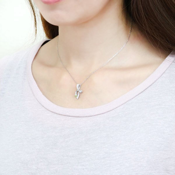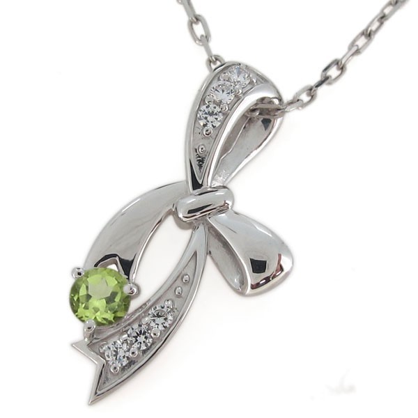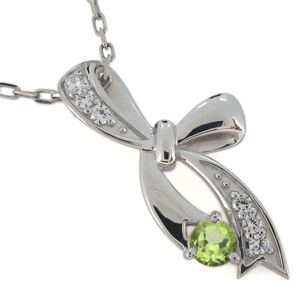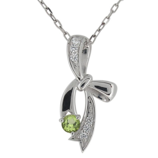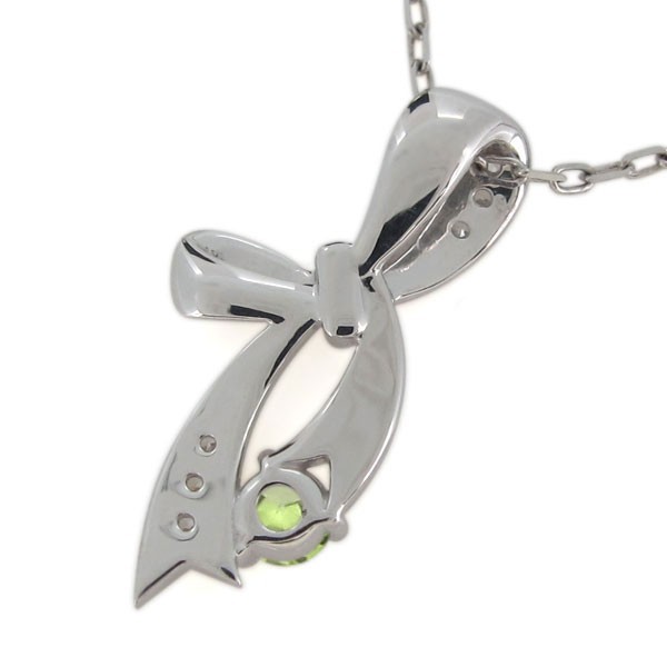 8月誕生石ペリドットを使用したプラチナ製の、リボンモチーフのネックレス・ペンダントです。